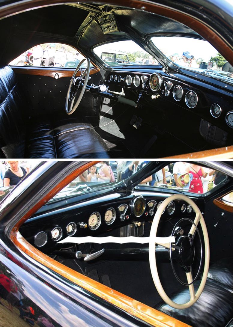 В этой поразительной машине было много буквально экзотических деталей. Приборы, в основном, использовались из арсенала моделей Cord. Но было еще полдюжины дополнительных приборов: высотомер, компас, самое современное по тем временам радио, вогнутые пуленепробиваемые тонированные стекла, устраняющие отражения и блики. Отдельная консоль над ветровым стеклом имела индикацию открытия дверей, включения света и радио.
