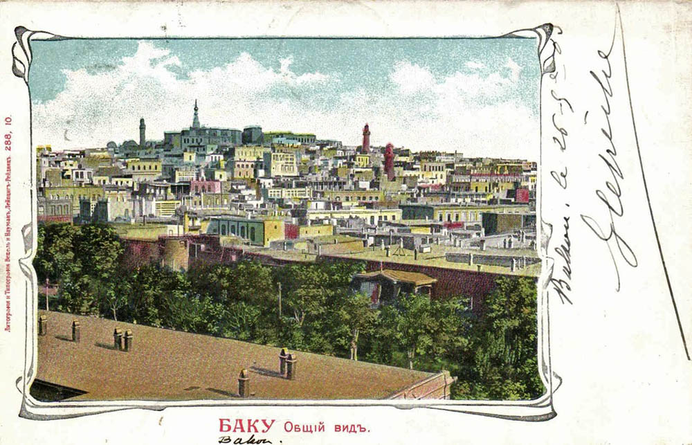 А вот очень интересная фотография 1904 г. На ней мы видим строящуюся Городскую думу (Баксовет) и Артистическое общество в городском саду (на всех открытках сад почему-то называется просто городским). Сейчас на месте Общества вход в метро.