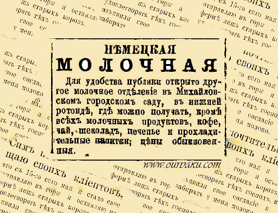 А бесплатно питьевую воду - из фонтанчика - бакинцы впервые стали пить в 1895 г.: "С четверга, 3 августа в городском саду открыт маленький фонтан опресненной воды, у которого поставлен стакан для желающих воспользоваться водой. Последних оказывается так много, что стакан берется прямо с бою" (газета "Каспий").
