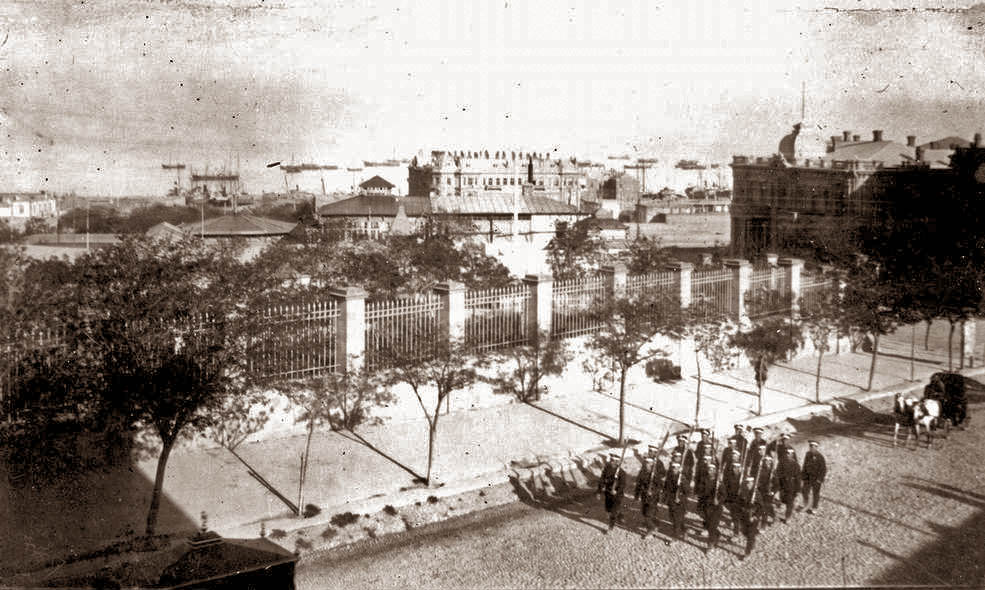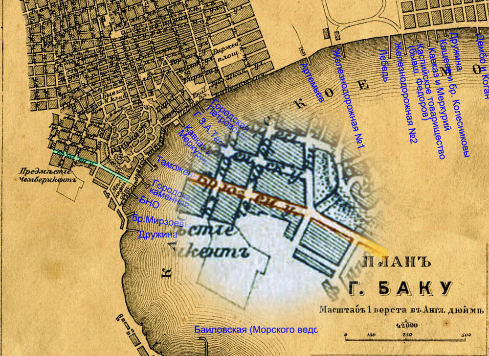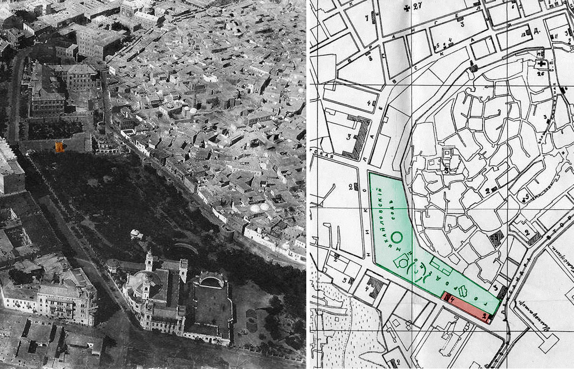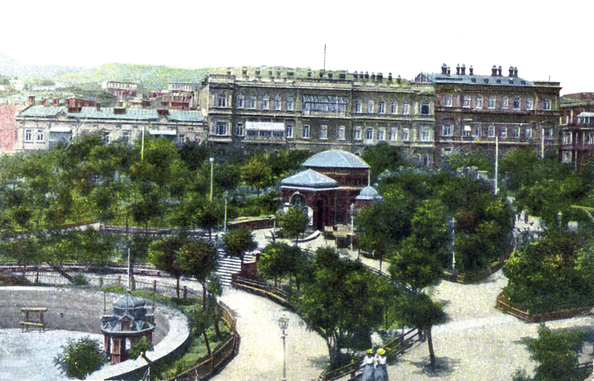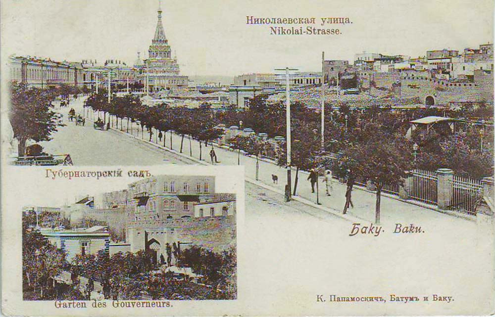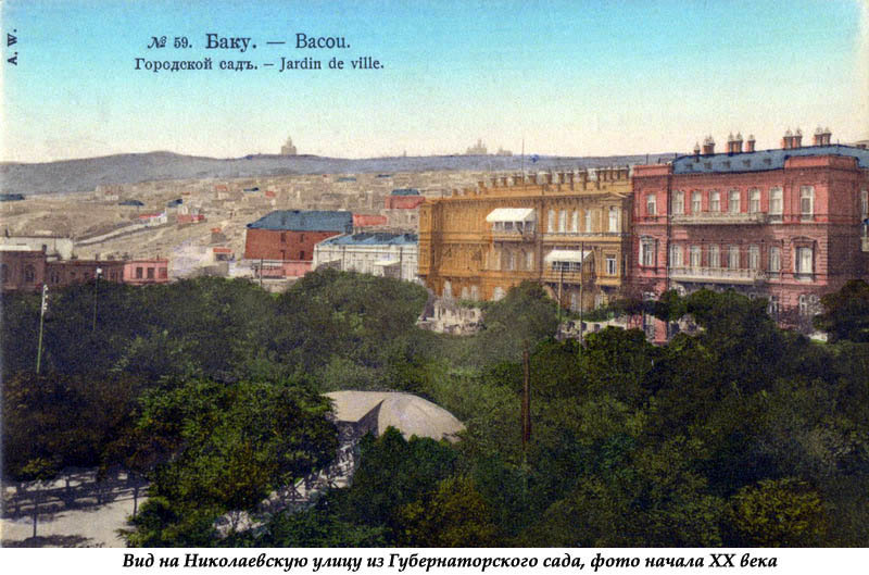 Обратите внимание: на аэрофотосъемке В. Корвин-Кербера 1918 г. оранжевым цветом выделена водозаборная будка. Она стоит на месте будущего метро "Баксовет". А на плане Баку конца 90-х темно-розовым выделен дом губернатора. Именно из-за этого дома Михайловский сад и стали звать Губернаторским. "После составления проекта планировки Николаевской улицы губернатор потребовал от города для своей резиденции участок на территории Михайловского сада, - пишет Ш. Фатуллаев в "Градостроительстве Баку XIX - начала ХХ веков". - Проект губернаторского дома разработал Гославский в 1895 году. На постройку здания ассигновано 145 000 руб. Этот проект обсуждался в городской думе, и большинство гласных категорически выступило против, считая, что "сад - единственное крупное зеленое пятно и служит местом отдыха бакинской публики". Отмечали, что надо добиваться расширения территории сада, а не отчуждать его земли, пусть даже для губернаторского дома. Вопрос о постройке губернаторского дома в центре города так и повис в воздухе, пока в середине 1890-х годов не был нанят только что выстроенный дом на набережной". (Речь шла, скорее всего, о М.А.Накашидзе, который губернаторствовал с 1894-го по 1905 г.)