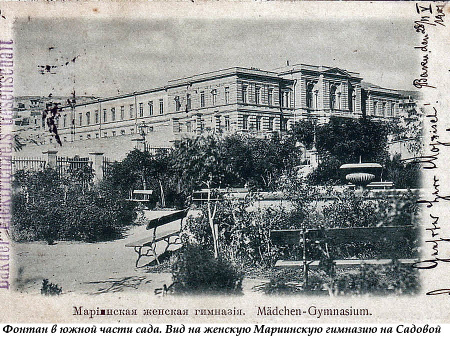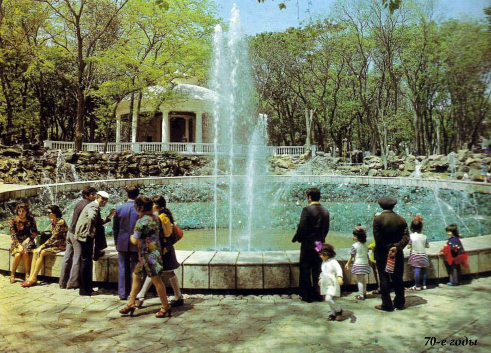 В 1894 г. был сооружен фонтан в большом бассейне городского сада. Диаметр бассейна был 25-27 м - если судить по масштабам карты 1894 г. Она удивительно точная для своего времени - четко ложится на современные гугловские космические съемки и полностью с ними совпадает. Это тот самый бассейн, на месте которого сейчас новый, окруженный беломраморной колоннадой.