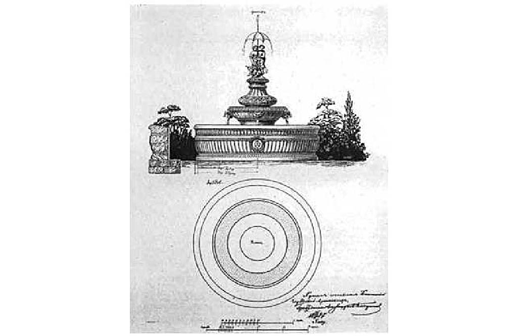 Потом в саду были сооружены еще три бассейна и фонтаны. Вот проект одного из них (архитектор А.Кандинов, 1887 г.):