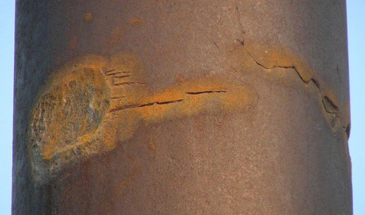 Пытливые ученые провели ряд исследований железных колонн в Дхар и Дели. Так, например, англичанами были взяты в качестве образцов мелкие кусочки металла колонн для проведения в Лондоне физико-химического анализа. По приезде в Лондон выяснилось, что образцы... покрылись ржавчиной. Вскоре шведский материаловед И.Вранглен с коллегами обнаружил на колонне зону сильной коррозии. Оказалось, что в районе заделки колонны в фундаменте она проржавела на глубину до 16 мм по всему диаметру. На воздухе - не ржавеет, в контакте с землей - ржавеет? Странно, согласитесь! Либо везде ржаветь, либо нигде не ржаветь. А коррозия на образцах, "оторванных" от колонны - это вообще за гранью понимания.