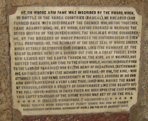 Колонна была воздвигнута в 415 году в честь царя Чандрагупты II, императора династии Гуптов, скончавшегося в 413 году. О чем гласит соответствующая надпись на санскрите: "Царь Чандра, прекрасный, как полная луна, достиг высшей власти в этом мире и возвел колонну в честь бога Вишну".