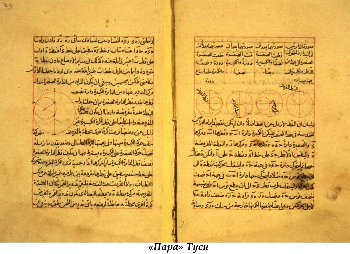 Туси составил также изложение "Альмагеста" Клавдия Птолемея и ряд других астрономических трактатов: "Трактат Муинийа по астрономии", дополнение к нему, "Сливки познания астрономии небесных сфер", "Памятку по астрономии". В этом цикле трактатов Туси строит свою схему кинематики небесных тел, отличную от птолемеевской. Ее основой служит так называемая "пара Туси", преобразующая вращательное движение в поступательное. Это геометрическая конструкция использована Туси в качестве альтернативы птолемееву экванту. Аналогичное построение было использовано также Николаем Коперником.