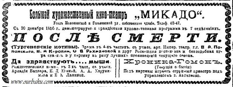 Кстати, именно из объявления в газете "Каспий" и стало известно, что на сцене "Микадо" можно было посмотреть и спектакли. Что касается фильмов, то в 1917 г. там демонстрировалась "грандиозная художественная программа в 7 отделениях": драма в 4-х действиях "После смерти" (Тургеневские мотивы), рождественская комедия "Да здравствуют... мыши" в 2-х частях и Хроника-Гомон (текущие события)". Последнее, судя по всему, хроникальные документальные кадры. Еще в объявлении сообщалось о "бесподобной игре" актеров и о том, что "Под картины играет струнный оркестр под управлением г-на Ангелеско". Кто сей г-н Ангелеско, остается только гадать, но т.к. "Микадо" только что открылся, можно предположить, что он был либо очень хорош (нужно было завлекать публику любыми способами), либо очень плох (кто из известных артистов пойдет работать в только что открывшееся заведение?).