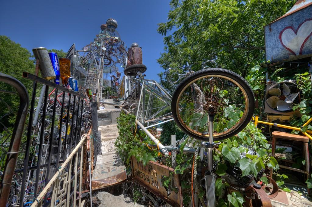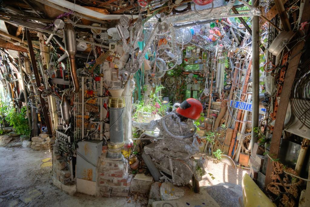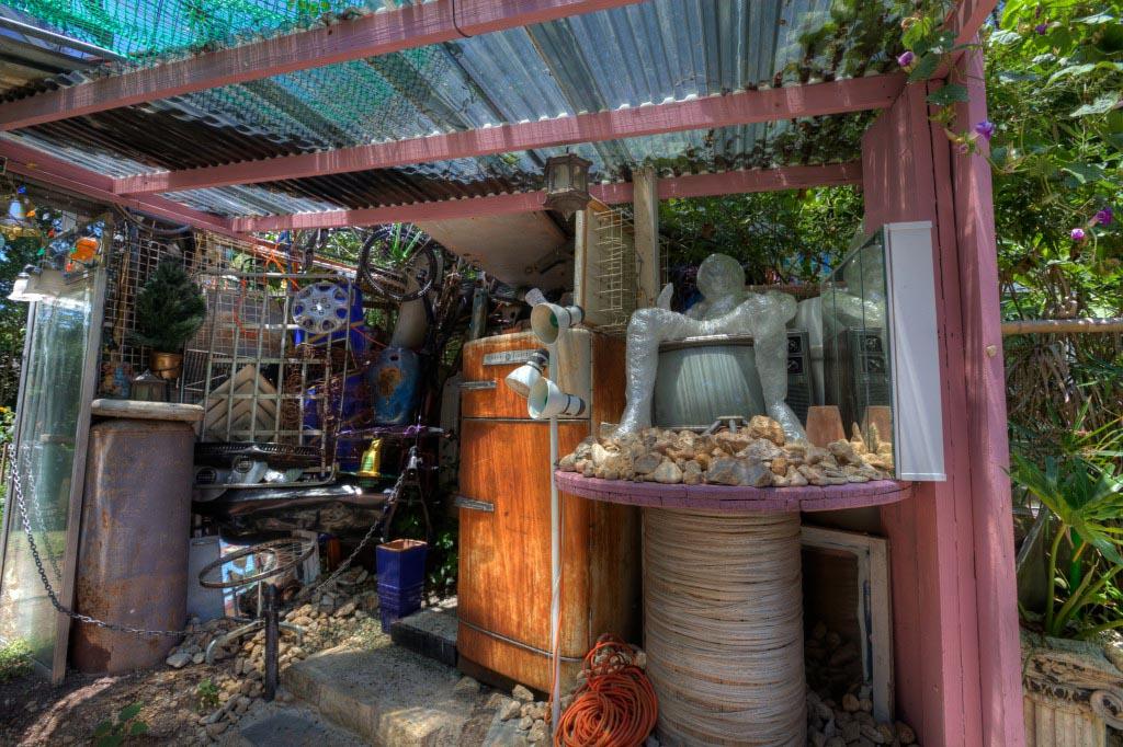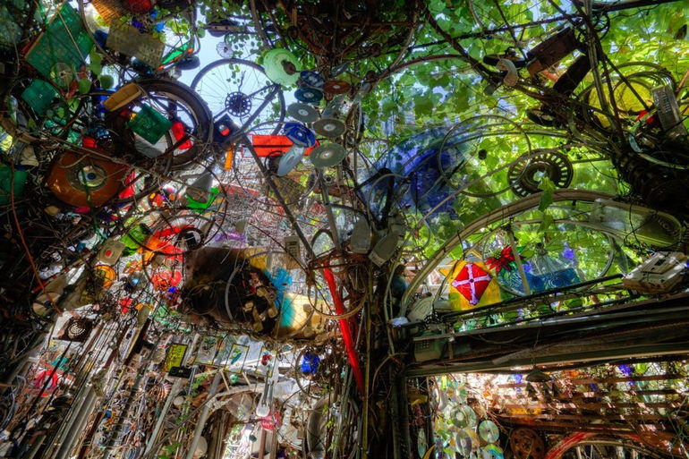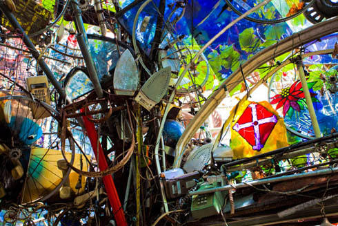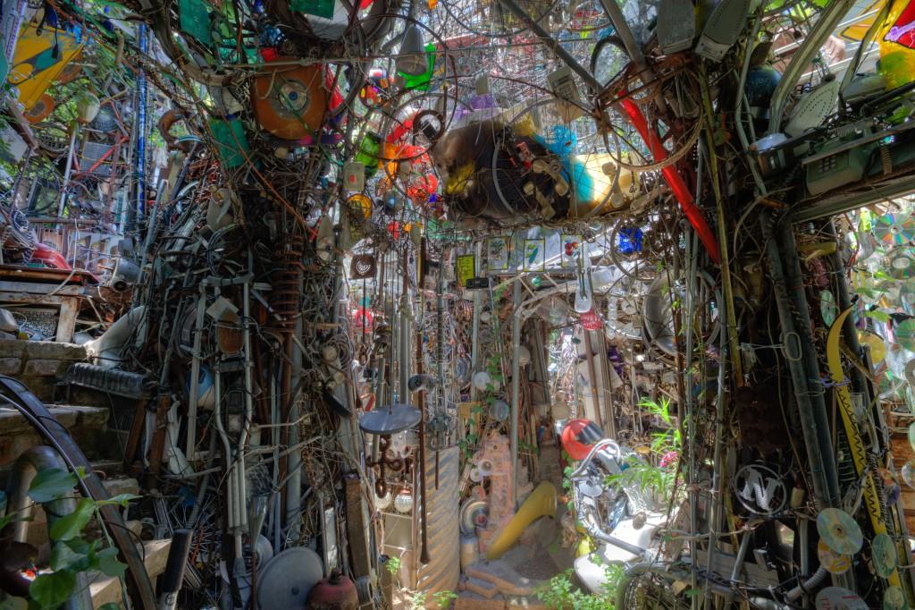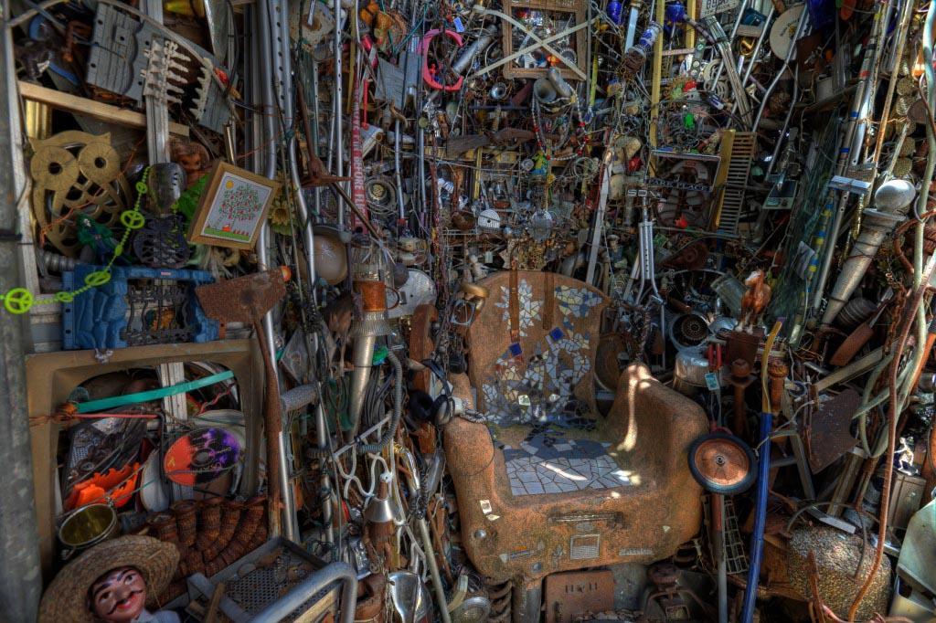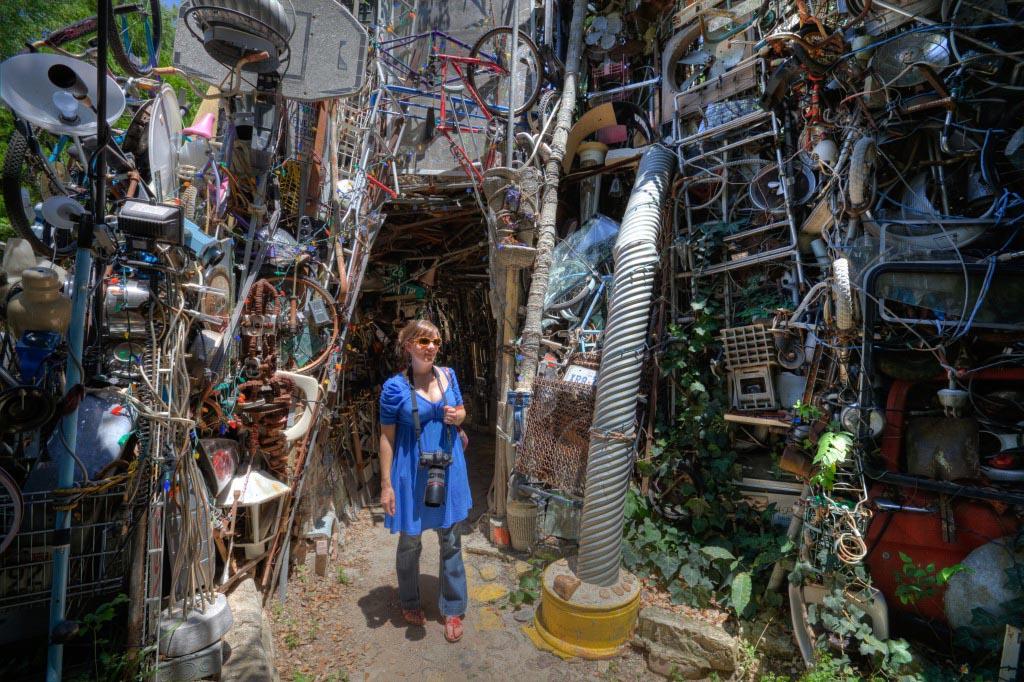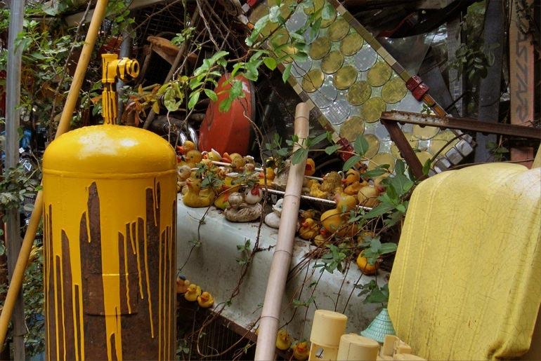Храм состоит из всего, что только можно себе представить на свалке: колеса от газонокосилок, бампера от машин, лестницы, кофемолки, бутылки, веревки, части велосипедов и еще масса вещей, прошлую жизнь и назначение которых сложно распознать.