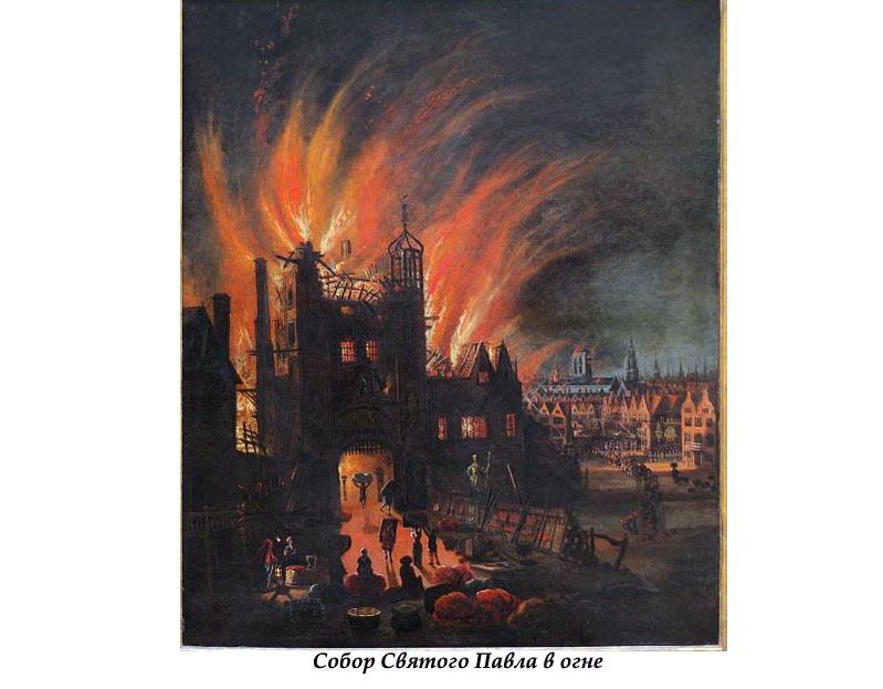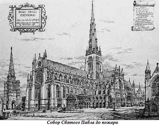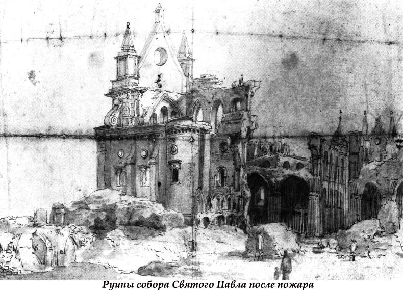 Самые страшные бедствия нанес пожар собору Святого Павла: от жары взрывались камни, разверзались древние гробницы, обнажая мумифицированные останки. Кровля собора плавилась, жидкий свинец ручьями растекался по прилежащим улицам. Это было страшное зрелище. Казалось, что какой-то огнедышащий дракон набросился на мирный город.