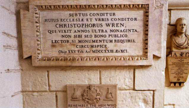 Кстати, именно Рен первым удостоился чести быть захороненным в соборе Святого Павла. На его могиле не установлено памятника, и лишь приведена эпитафия на латыни: "Lector, si monumentum requiris, circumspice" - "Читатель, если ты ищешь памятник - просто оглянись вокруг".