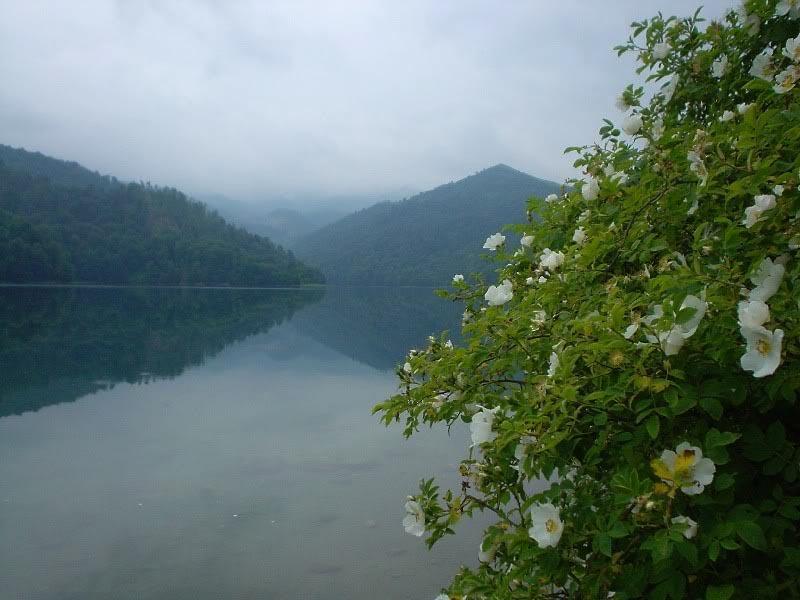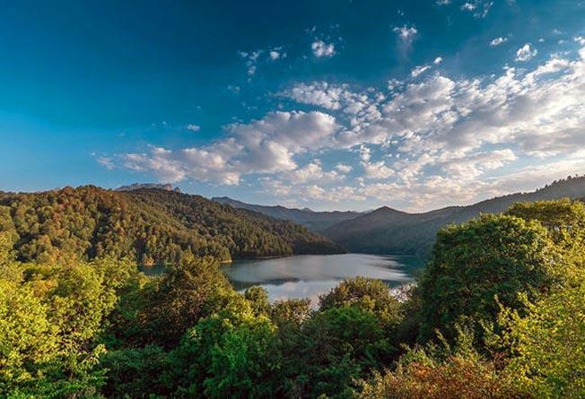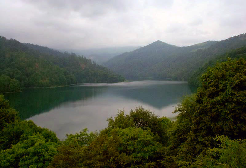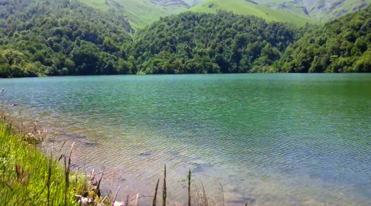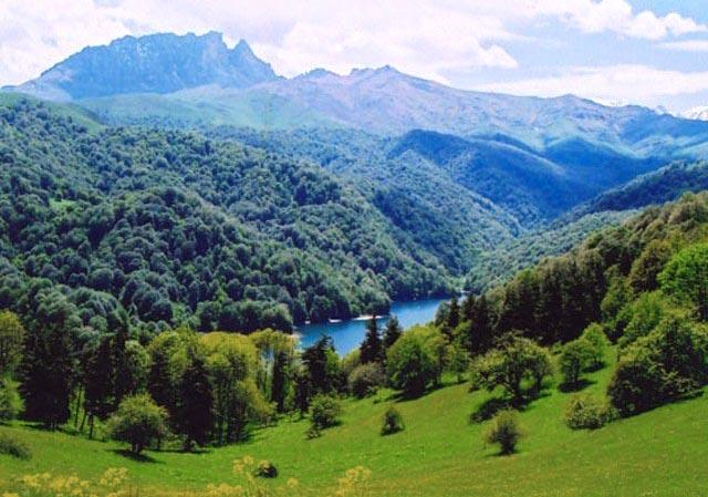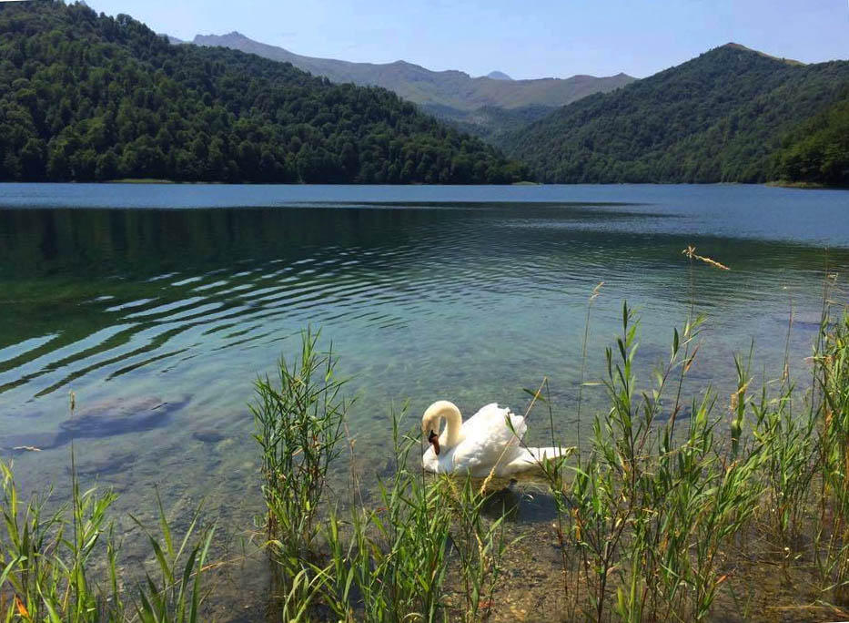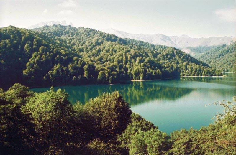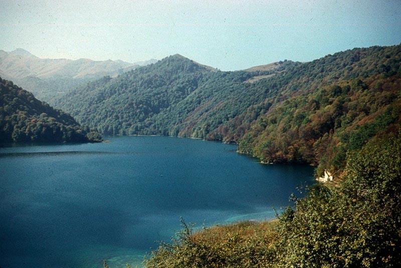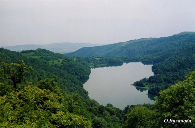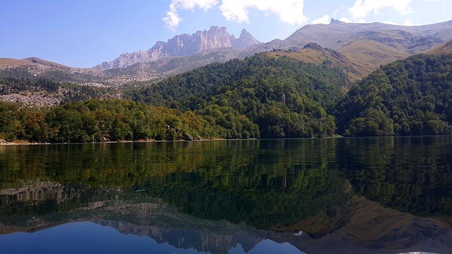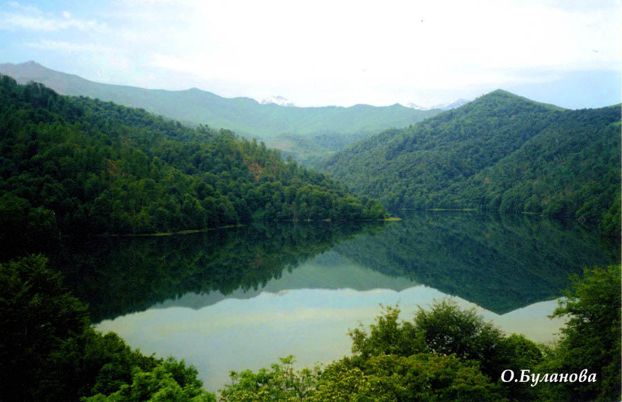 Такое чувство, что сотворил это чудо великий художник, не упустив из виду нечего, никакой мелочи, которая могла бы сыграть на общее впечатление. Здесь и горы, покрытые коврами лугов, и густые зеленые леса, и прозрачный звенящий воздух, и зеркальная гладь воды, отражающая испуганно озирающегося оленя, и скалистая вершина горы Кяпаз с вечными проплешинами снегов, как венец завершающая эту величественную картину.