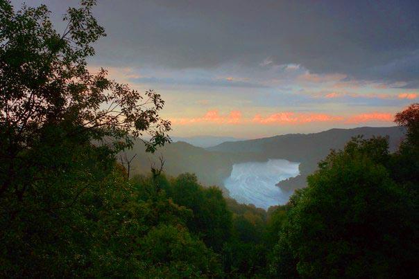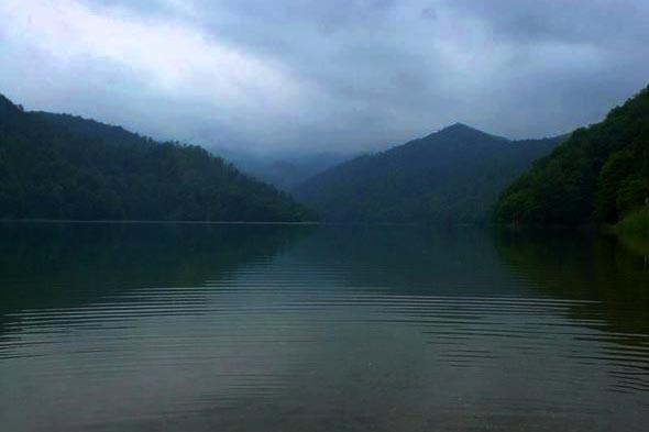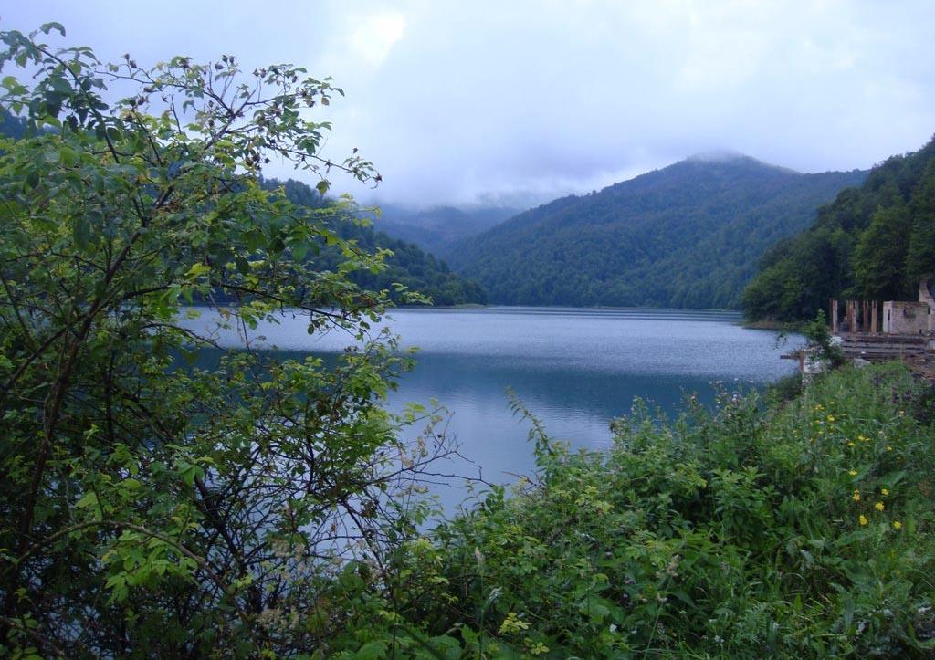 Над озером стелился чуть видимый туман, который потом, на наших глазах рассеялся, и темно-зеленые, стоящие вокруг горы вынырнули из его глубины. Над озером возвышался Кяпаз, легендарная гора, причастная к тайне рождения озера.