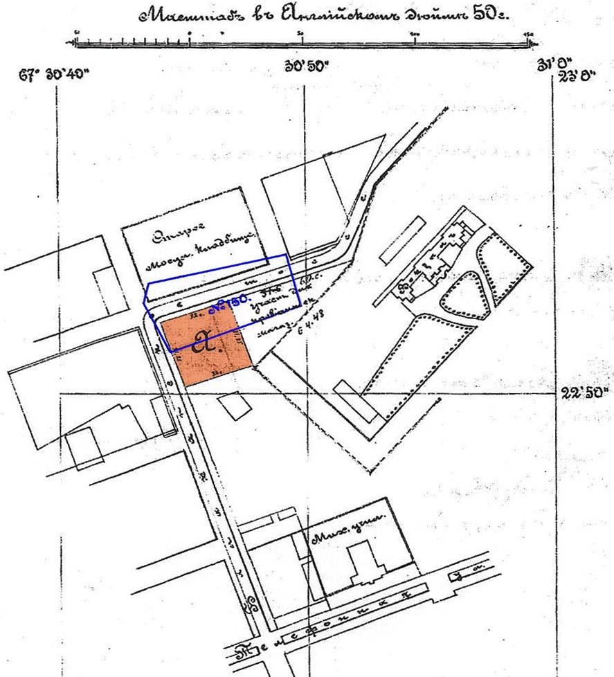 Розоватым цветом на плане показан участок, выделенный под постройку церкви-школы: