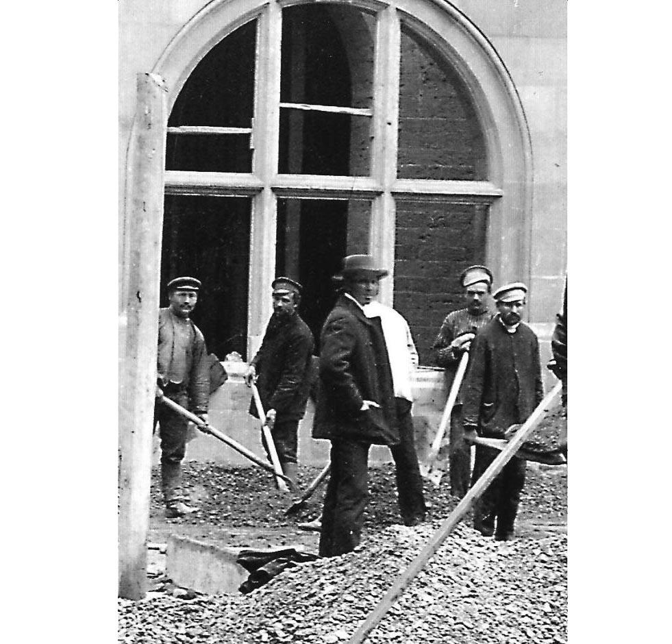 К строительству училища группа единомышленников приступила в 1908 г. В архиве А.Я. Дубова сохранилось несколько фотографий, запечатлевших рабочий процесс строительства. Они датированы 1909-1911 гг.