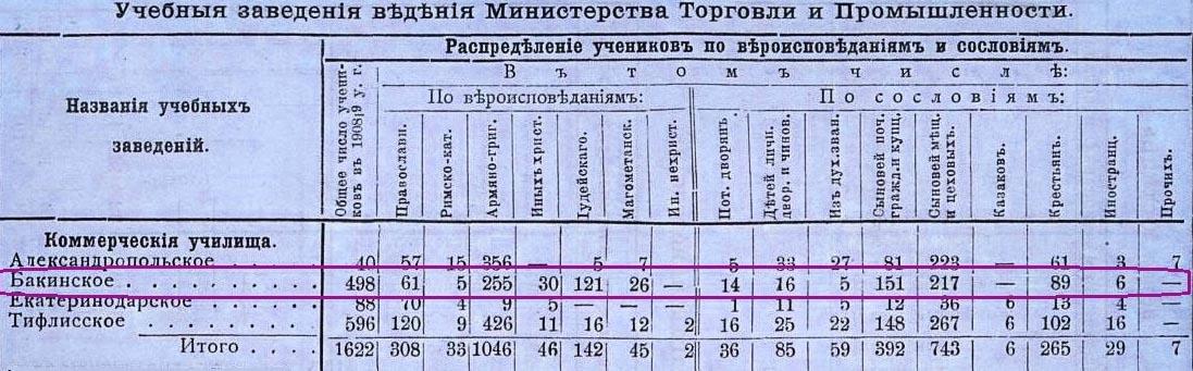 Пока шло строительство, учебный процесс не прерывался - занятия шли в старом здании. В 1908/09 учебном году в Бакинском коммерческом училище обучалось 498 студентов. Если посмотреть статистические сведения, опубликованные в "Кавказском календаре" за 1910 г., то среди перечня сословий увидим 89 крестьянских детей и лишь 14 из семей потомственных дворян. Поэтому когда говорят о бедственном положении крестьянства до Октябрьского переворота, о невозможности получить хорошее образование, хочется отослать говорунов вот к таким данным.