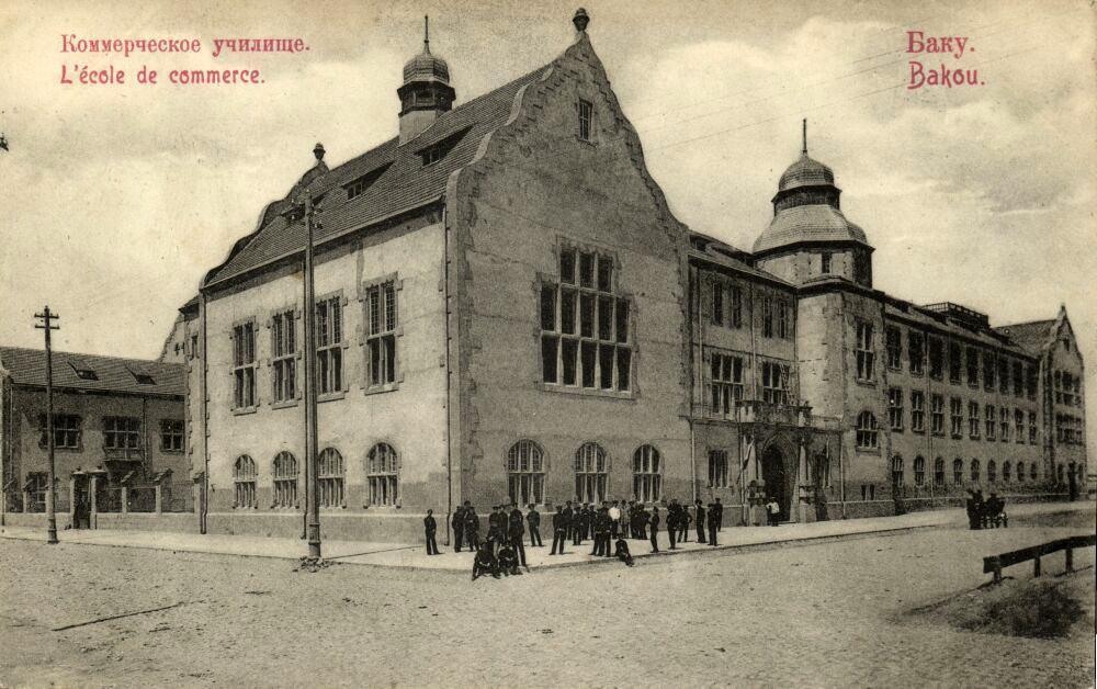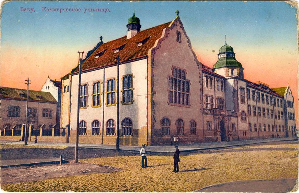 Изначально это здание на Меркурьевской улице (ныне Зарифы Алиевой) строилось для Коммерческого училища. Создание по всей Российской империи коммерческих училищ - это отдельная тема. Если вкратце, то в конце XIX в. с развитием в России капиталистических отношений в торгово-промышленной и банковской сферах назрела необходимость в высококвалифицированных кадрах. В проекте "Положения о коммерческих училищах", разработанном директором департамента торговли и мануфактур В.И. Ковалевским и представленным в Государственный совет Министерства финансов С.Ю. Витте говорилось, что "правильная постановка коммерческого образования должна быть признана одною из главнейших мер для успешного развития нашей внутренней и внешней торговли".