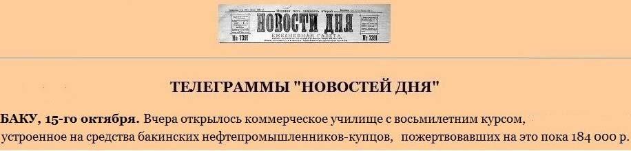 Естественно, что реформа образования не могла не коснуться и Баку. В октябре 1899 г. наш город по служебным делам посетил вышеупомянутый разработчик Положения Ковалевский. Именно Ковалевский 4 октября 1899 г. подал бакинским предпринимателям и меценатам мысль о необходимости создания в Баку коммерческого училища. В числе первых, кто внес деньги, были Муса Нагиев, и до этого ежегодно выделяющий на обучение своих стипендиатов в различных учебных заведениях по 8 тыс. рублей, Шамси Асадуллаев и, конечно, Зейналабдин Тагиев. Всего в короткий срок было собрано 170 тыс. руб.