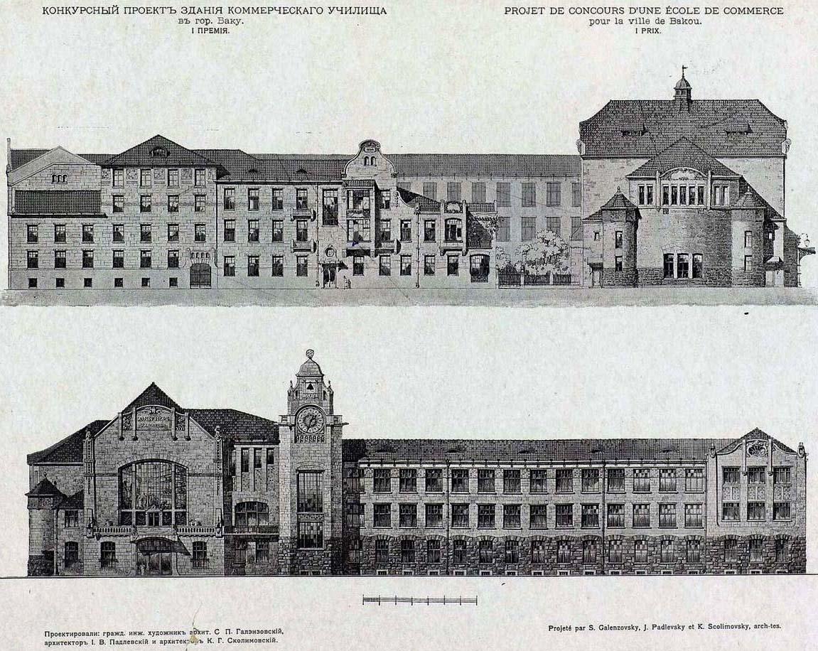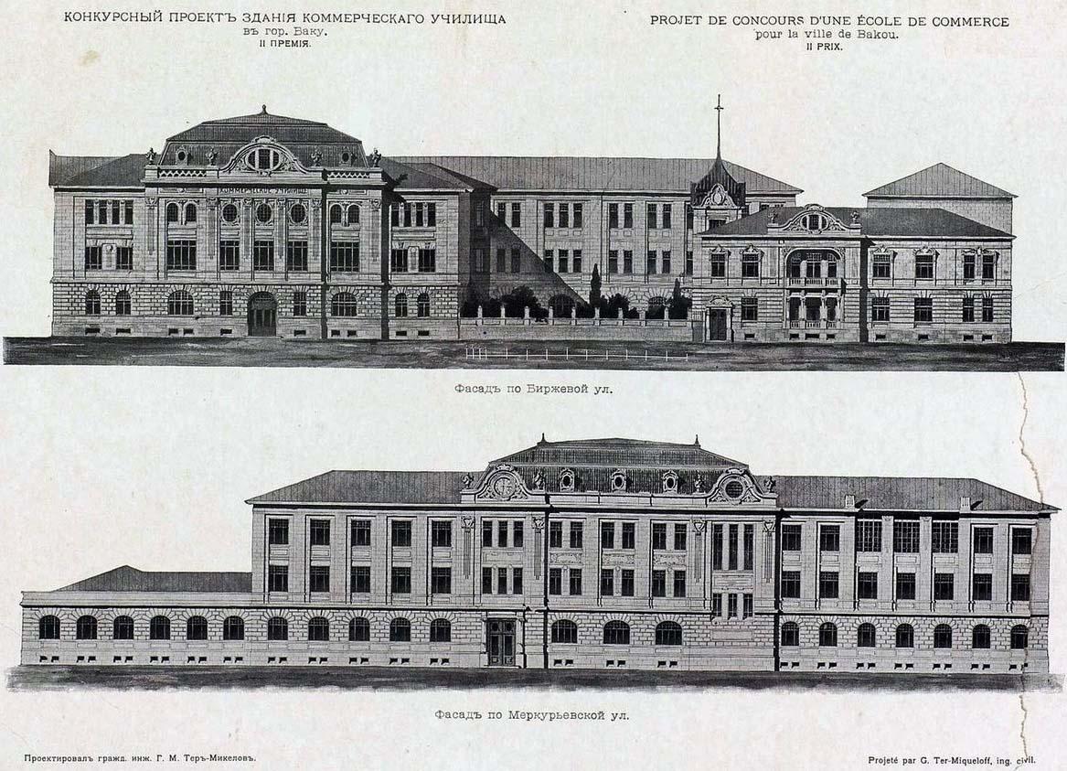 Вероятно, конкурс был не один, т.к. в итоге для Коммерческого училища был принят тот проект, который и был осуществлен. Автором его являлся Гавриил Тер-Микелов (1874-1949), автор талантливых архитекторских проектов в Тбилиси и Баку.