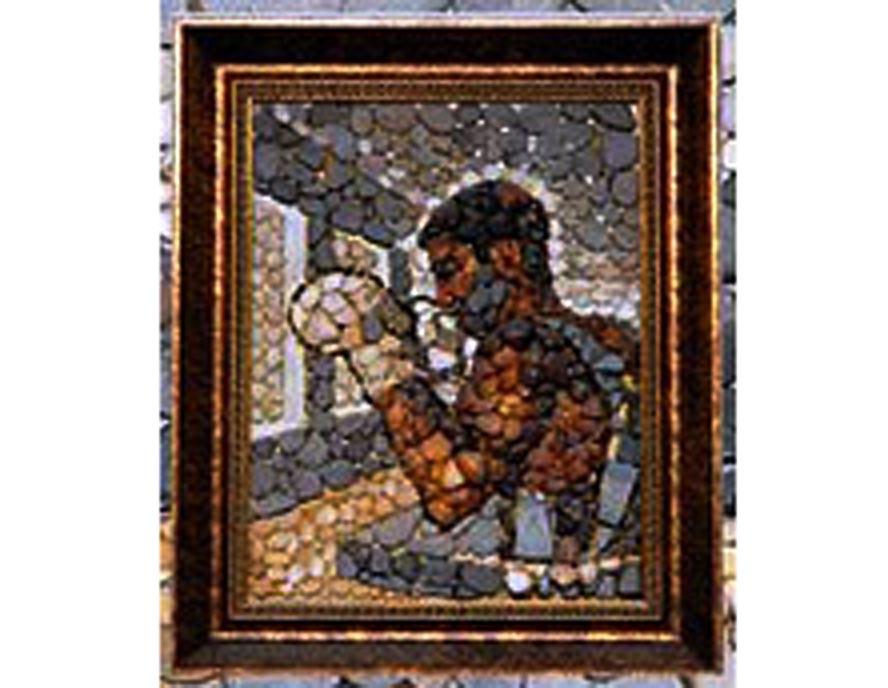 Сначала на тонкой фанере художник рисовал контуры, затем приклеиваю камни, которые собирал на берегу Каспийского моря и в регионах страны. У каждого камня не только свой цвет, но и своя аура - теплая или холодная, притягивающая или отталкивающая, и поэтому для каждой работы приходилось тщательно подбирать материалы не только по форме и цвету, но и соответствию создаваемого образа.