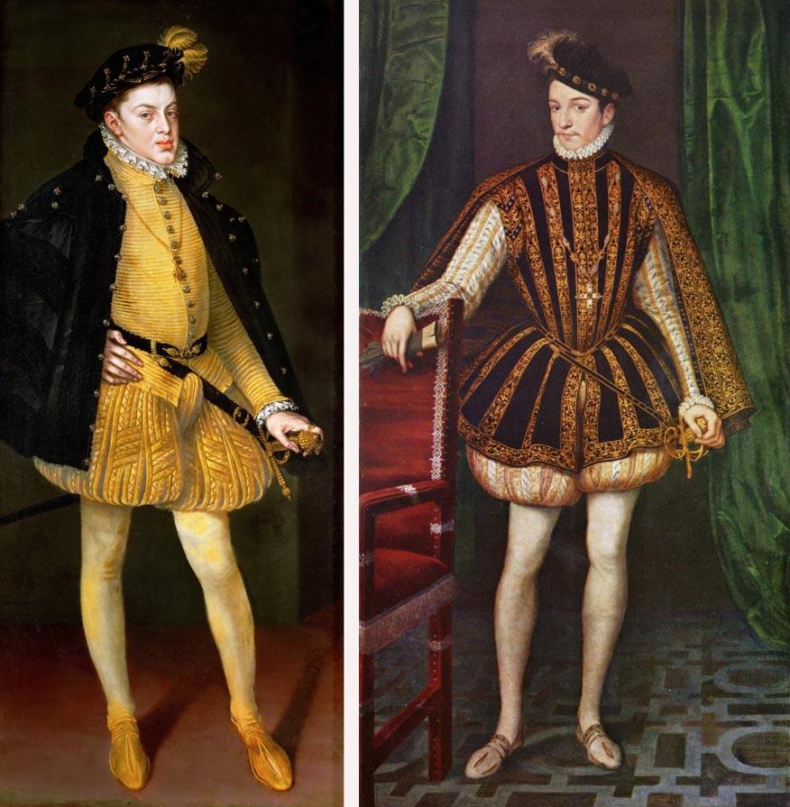 Но давайте вернемся к ногам. И теперь для разнообразия мужским. Потому что, скажем, в XVI-XVIII столетиях понятие "красивые ноги" относилось, прежде всего, к мужчинам. Женщины-то ног не показывали! Так уж получилось, что в XVI-XVIII столетиях девочки - в "макси", мальчики - в "мини". Поэтому мужчинам было можно носить смешные портки разной длины, начиная с коротких пышных штанов XVI века до узких кюлотов с пуговкой конца XVIII столетия.