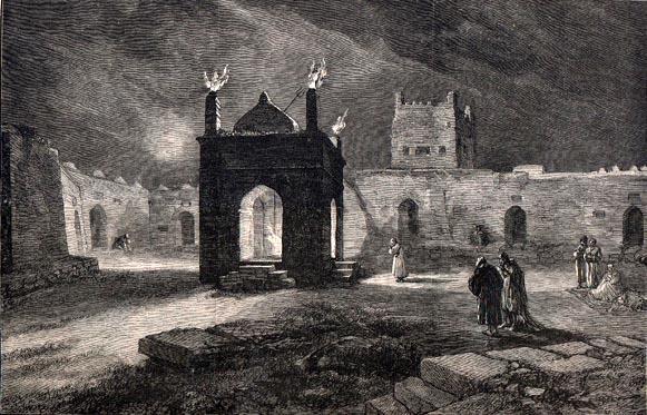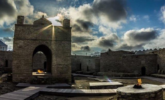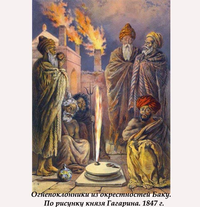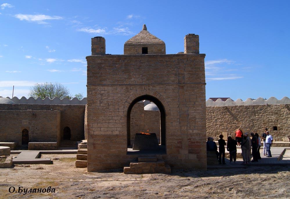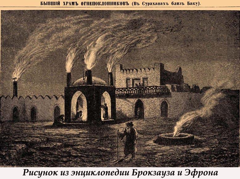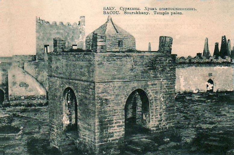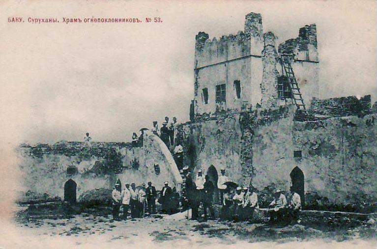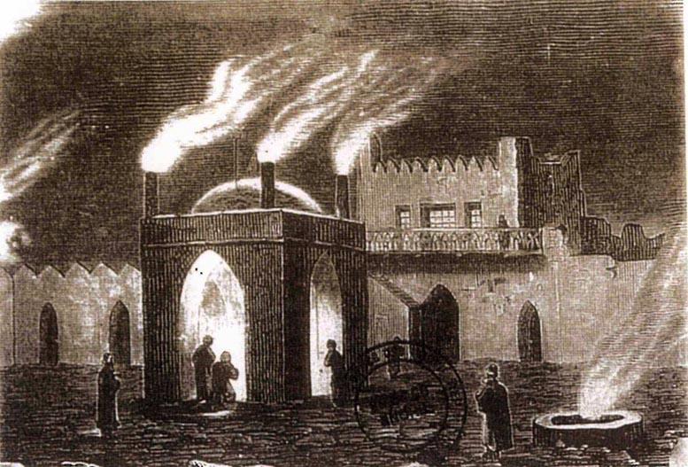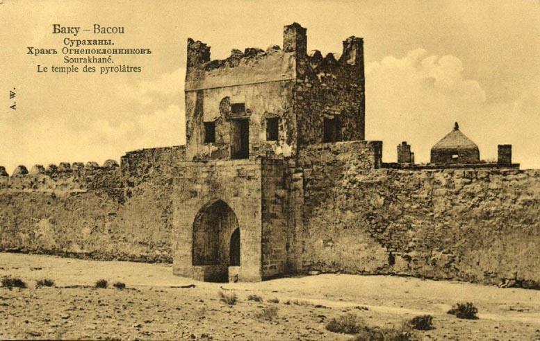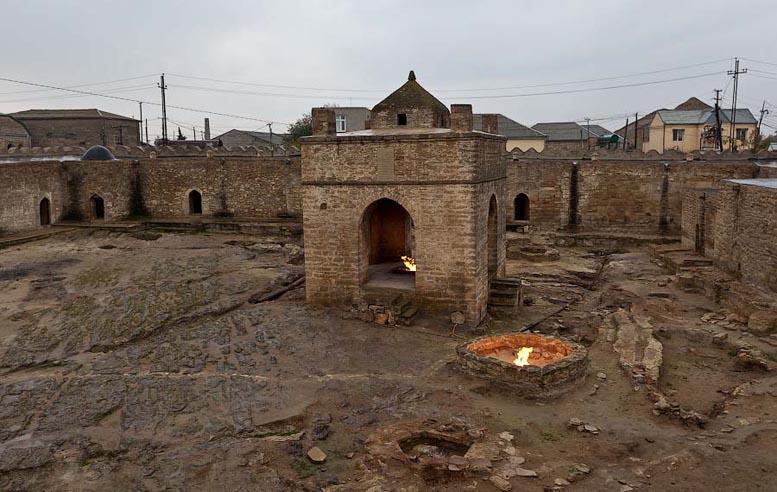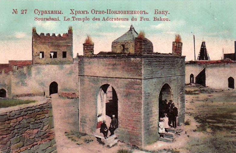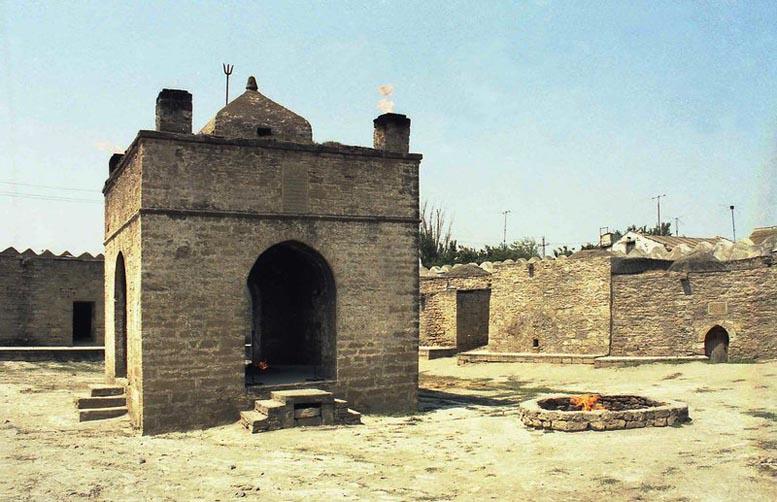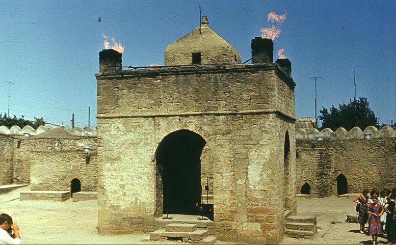На Апшеронском полуострове во многих местах прямо из-под земли бьет огонь. Самые ранние упоминания об этом явлении встречаются у Приска Панийского (V в.), в арабских источниках VII-Х вв. Зороастрийцы, жившие в Закавказье, чтили неугасимый огонь и строили храмы. Один из таких храмов – Атешгях, что можно перевести как «Место Огня», сохранился до наших дней в селении Сураханы. Но он не является исключительно храмом, хотя это мнение кочует из источника в источник. Это монастырский комплекс.