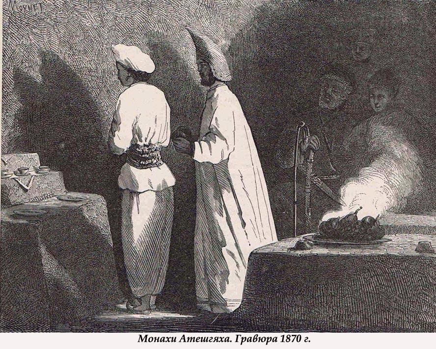 Однако монахи думали иначе: они видели в этом кару богов за недостаточное смирение плоти и недобросовестные молитвы. И постепенно уезжали - к 70-м гг. XIX в. в Атешгяхе остался лишь один монах, да и тот вернулся на родину предков в 1883 г. Атешгях пришел в запустение.