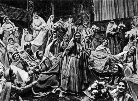 В Европе женщины выходили на сцену с открытым лицом еще с античных времен. На мусульманском Востоке такое не могло привидеться ни во сне, ни в бреду. На дворе начало ХХ в., а мусульманские законы все еще дают о себе знать. Женщины не только не выступают в театре, но практически не появляются там в качестве зрительниц, а если и появляются, то с закрытыми лицами и в специальных ложах, занавешенных кисеей.