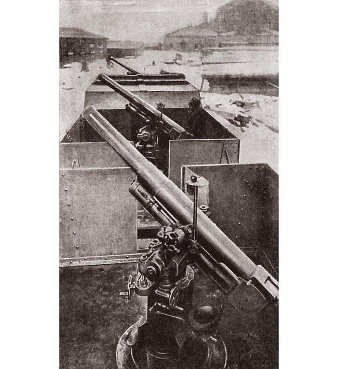 Много сил восстановлению бронепоездов отдавали рабочие Ижорского адмиралтейского и механического завода в Колпине. В 1918 г. здесь собрали первый поезд собственной конструкции. Основу программы составляли бронепоезда, оснащенные 3-дюймовыми противоаэропланными орудиями. В центре 4-осной платформы устраивался пулеметный каземат, выполненный из однослойной брони, имеющий по 4 станковых пулемета на борт; а на каждом ее конце открыто размещались зенитка, защищенная откидными экранами.