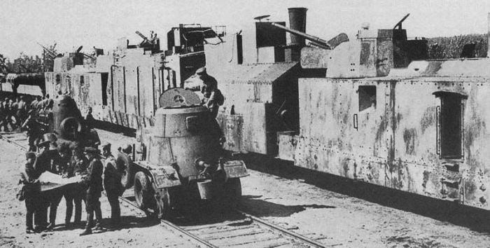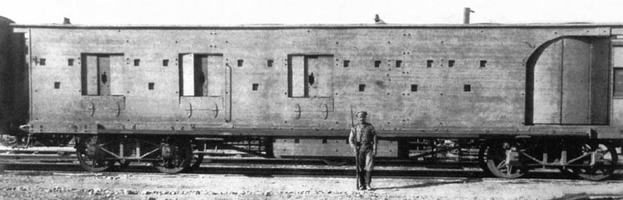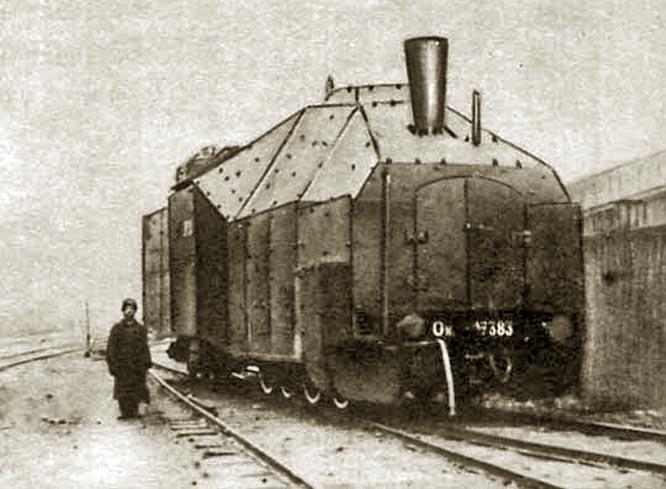 В России произошло нечто подобное. По внешнему виду российские "блиндпоезда", массово строившиеся в 1918-1919 гг., мало отличались от тех английских. Создавались они обычно без чертежей, буквально в течение суток. Это были товарные вагоны, угольные пульманы или платформы с сооруженными на них блиндажами из шпал, бревен, досок, рельсов, мешков с песком или металлической стружкой, кусков металла и т.п.