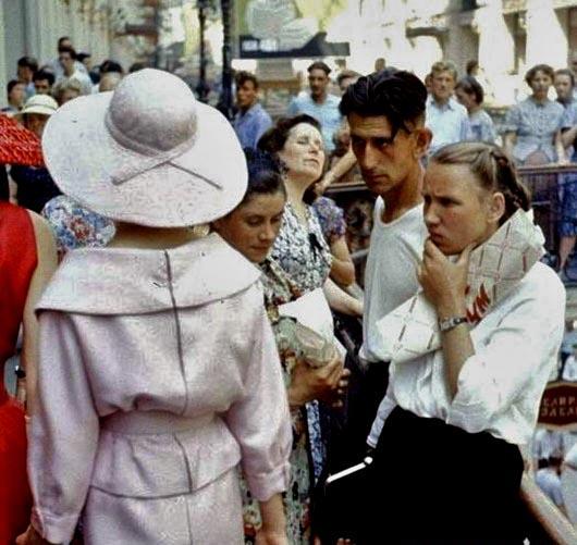 Но пока еще Сталин жив, на дворе - конец 40-х годов, и советское правительство, допустившее сразу после войны в страну огромное количество "примет" западной жизни в виде трофеев, кинофильмов и журналов, а также устных рассказов о западной жизни, быстренько одумалось и стало "завинчивать гайки". Эти "гайки" заворачивались все сильнее, и рассчитывать на быстрое распространение Нью Лук в СССР не приходилось. Здесь еще донашивали трофейные наряды, бывшее жутко популярными...