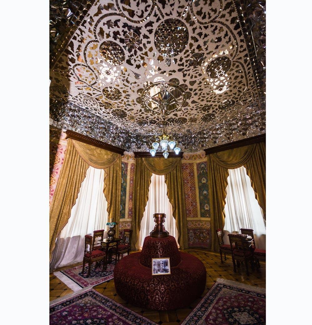 Одно из самых красивых и впечатляющих помещений в доме-музее - Восточный зал для приема гостей. От украшенных золотом и расписанных стен и потолка невозможно отвести взгляд - при внимательном рассмотрении здесь можно увидеть изречение из Корана "Нет Бога кроме Аллаха".
