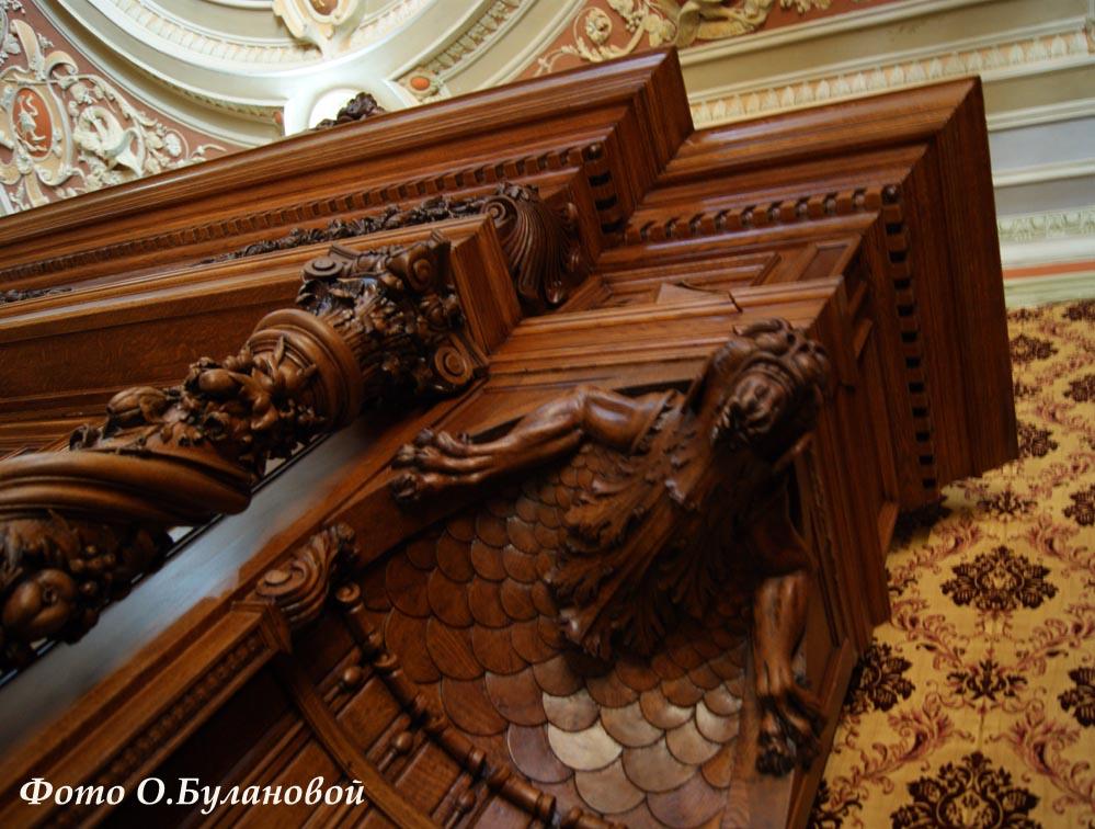 Здесь же расположился роскошный резной буфет из дуба и каштана, построенный в Польше. Именно построенный - потому что мебель в те времена делали по правилам строительства небольших домов. И этот буфет - не исключение: выглядит как небольшая резная избушка из сказки. И высота соответствующая - более трех метров.