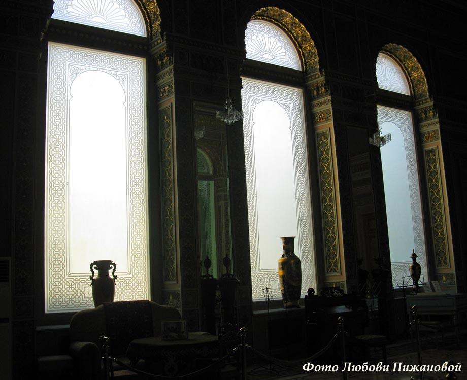 Пытались вывести и арабскую вязь на огромных окнах из венецианского стекла, но, к счастью, советским чиновникам от истории это не удалось. Оказалось, арабскую вязь умелые итальянские мастера нанесли внутри стекол. Надо было менять сами стекла, но они были очень красивыми и, что важно для новой власти - ценными, поэтому их не тронули.
