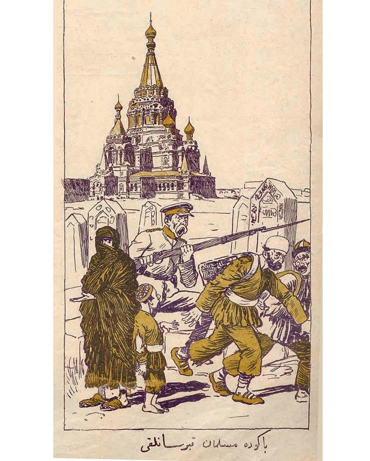 И даже после окончания строительства, когда все увидели, какая красота получилась, нет-нет, да и всплывала старая больная тема. Так, в журнале "Молла Насреддин" в 1908 г. была опубликована карикатура, на которой на заднем плане - собор, на первом плане - русский городовой со штыковой винтовкой отгоняет мусульман от храма, а на среднем плане - старинные надгробия.