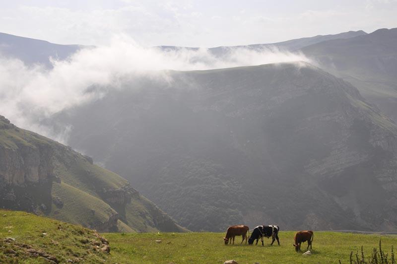 Таких умных коз мне довелось до этого видеть всего один раз - в каком-то из сел близ Шеки. А еще коровы - ухоженные, холеные, разноцветные. И стройные.