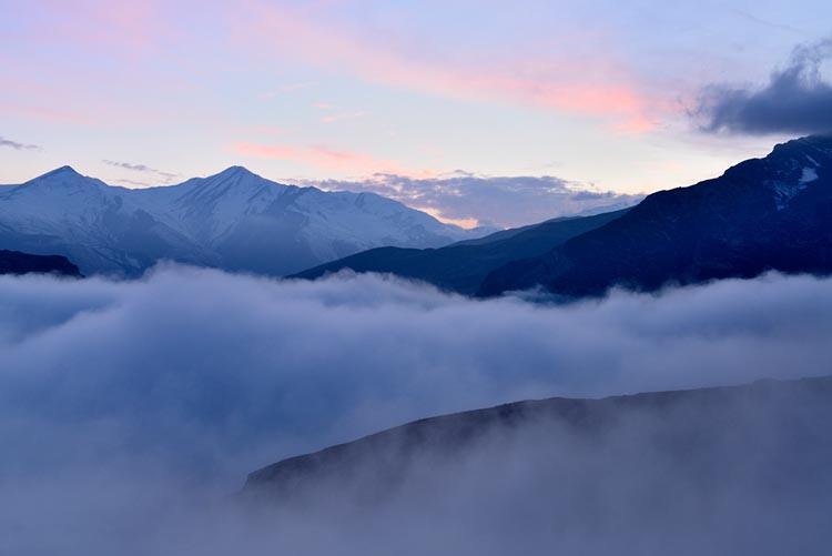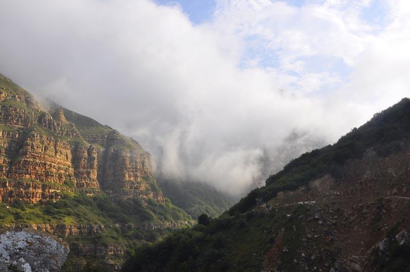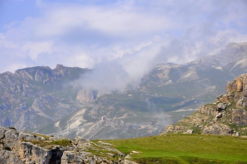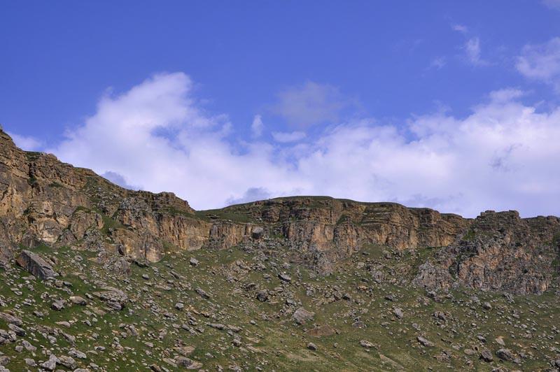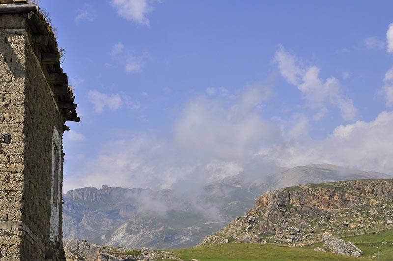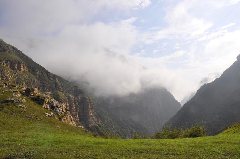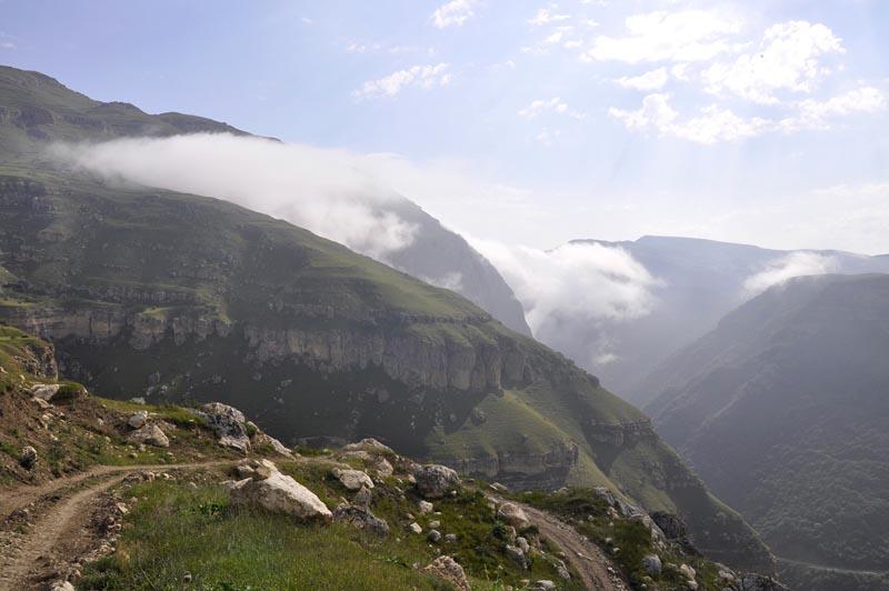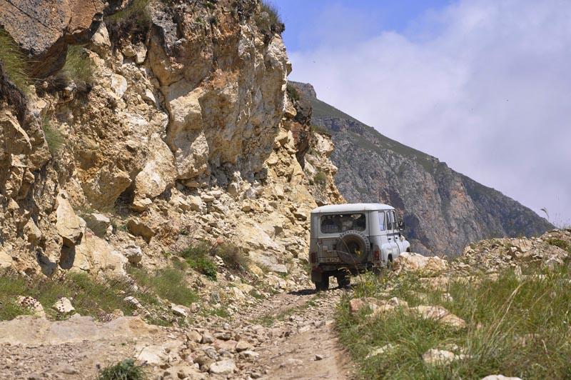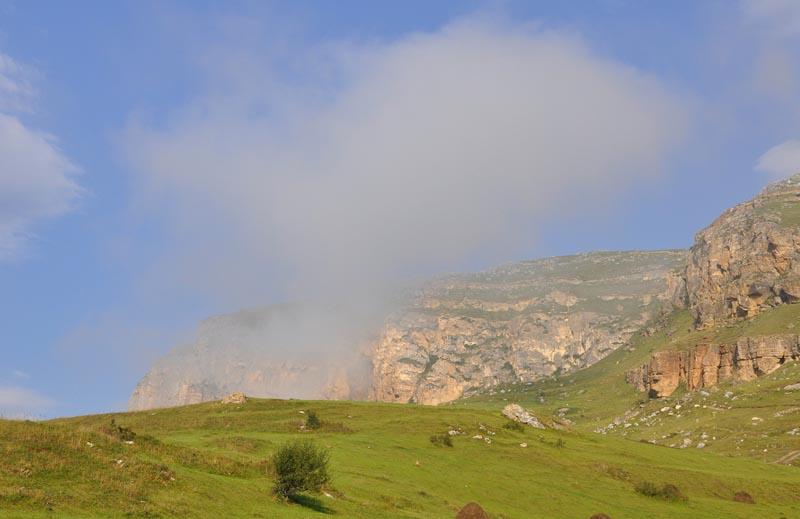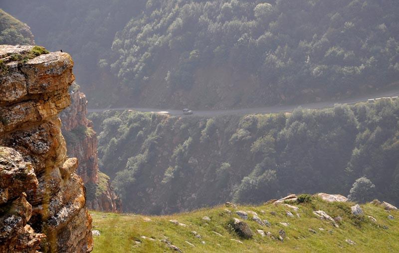 Когда поднимаешься выше облаков, создается ощущение, что машина погружается в них, парит, словно тот орел (или ястреб?) в небе, что уже давно сторожит свою жертву - какого-нибудь суслика или зайца. Клочки облаков лежат (или тоже парят?) буквально под ногами, закрывая местами отвесные красно-рыжие скалы, похожие на скалы Большого американского каньона. Все вокруг такое дикое, такое естественное, что ни за что не подумаешь, что где-то там, на высоте двух километров, есть человеческое жилье.