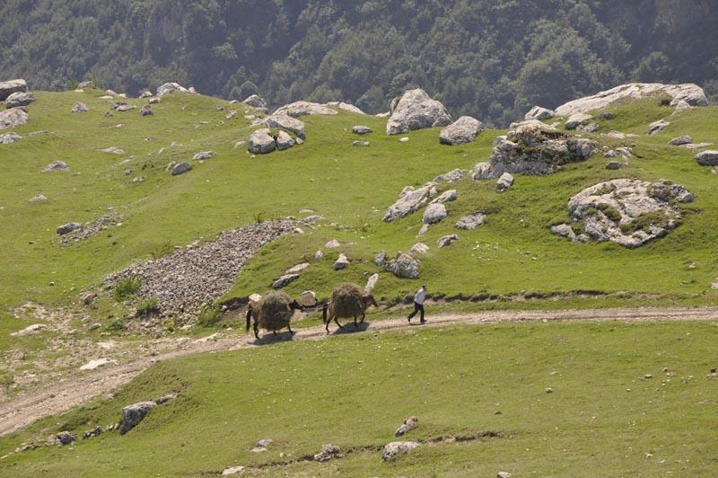 Или какие-то совершенно фантастические повозки. Нет-нет, не арбы, а словно причудливая смесь то мотоцикла и корзины для мусора, то старого контейнера для мороженого времен эпохи социализма и мопеда. Правда, телеги, запряженные лошадьми, тоже встречаются. На них веселые мальчишки везут то дрова, то хворост, то какое-то коричневое пожухлое сено. Видимо, прошлогоднее. Груженые тем же сеном лошади тоже встретились. Лошадей - какая-то особенная мелкая порода, наверное - было почти не видно за копнами сена сверху.