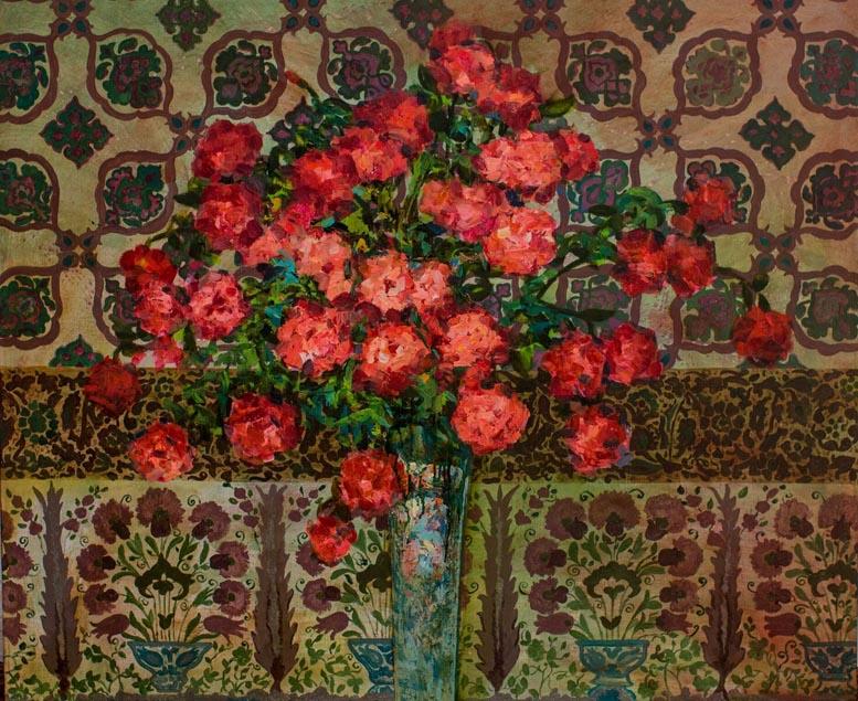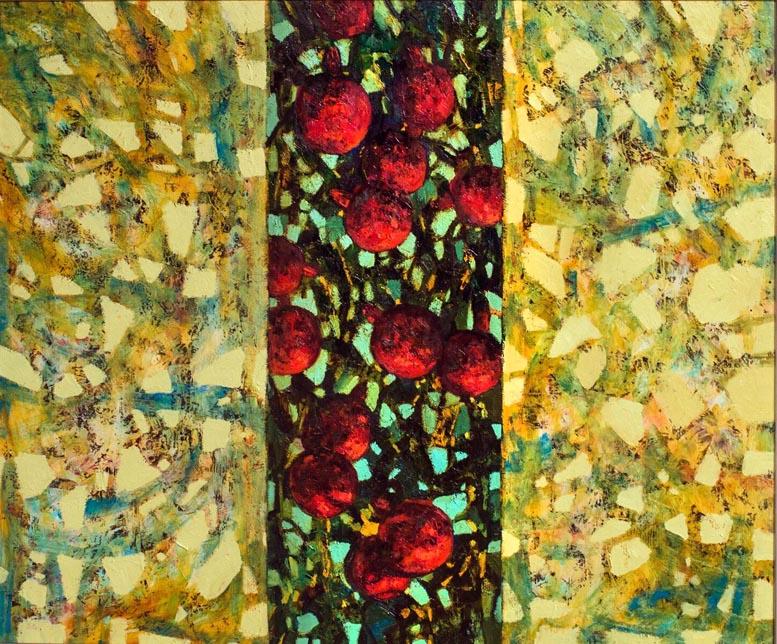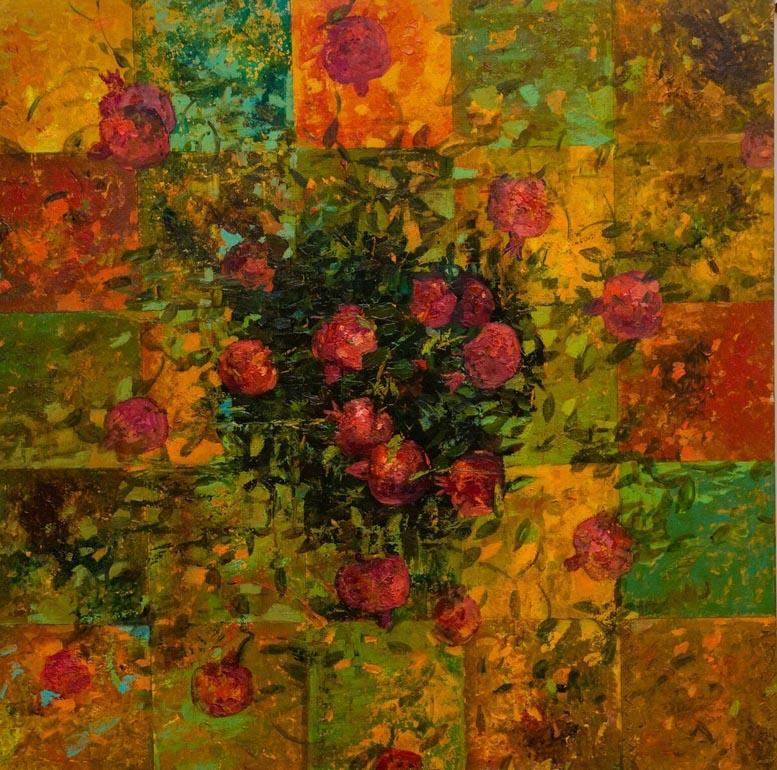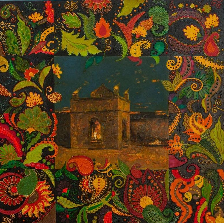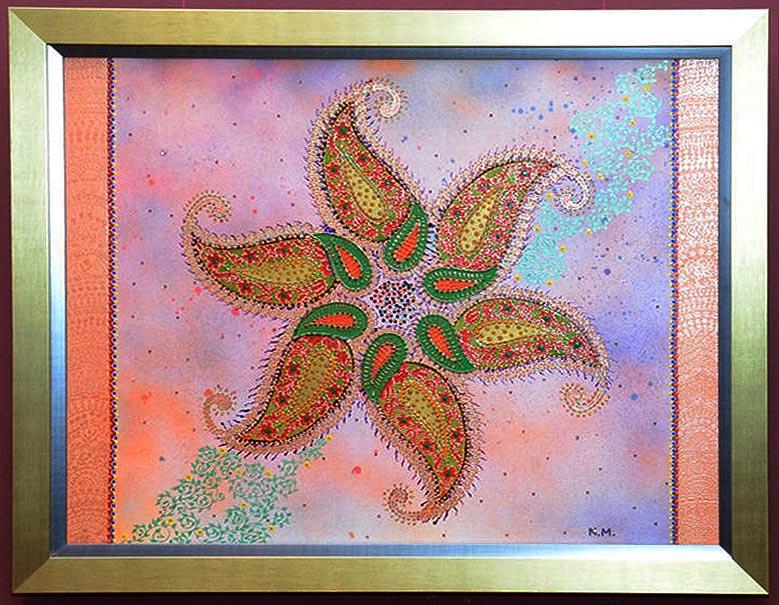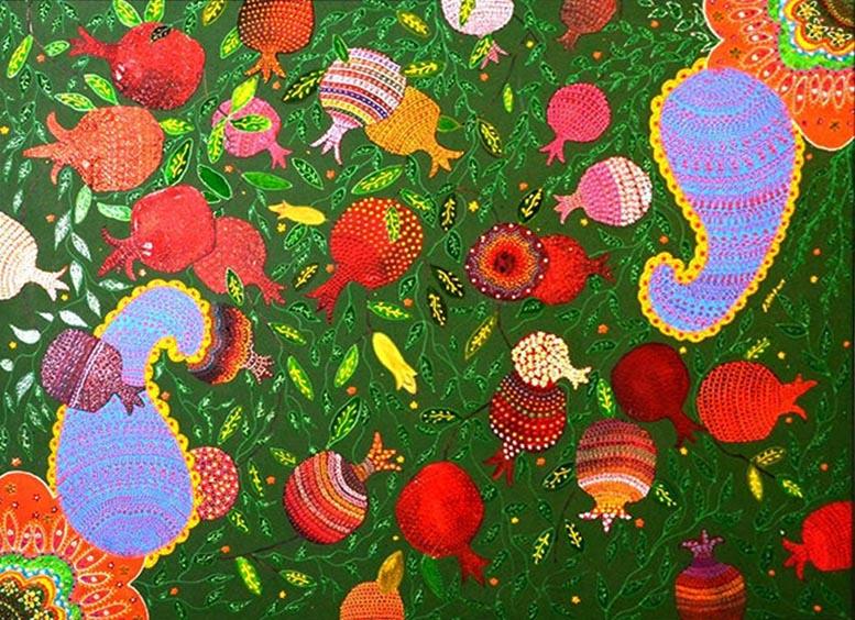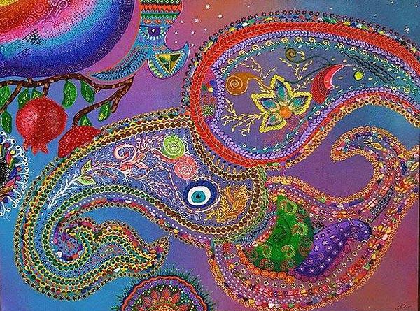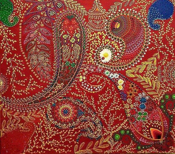 На красочных полотнах Милены возникает то женский образ, окруженный растительным мотивом, то древний символ - гранат, а вокруг все те же узоры. Среди них самый, пожалуй, часто встречающийся - это бута. Этот символ очень древний, пришел к нам из далеких времен зороастризма и прочно поселился в восточной орнаменталистике; позднее бута завоевала весь мир - достаточно вспомнить советские ткани или современные европейские мужские галстуки, кашне, украшенные этим узором. В переводе с хинди "бута" означает "пламя". Сразу напрашиваются параллели с зороастризмом - ведь языки пламени и символизируют эту религию.