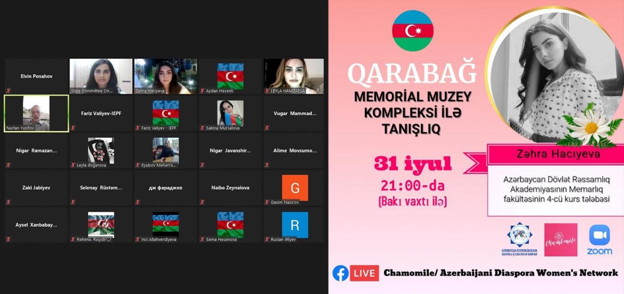 Diasporla İş üzrə Dövlət Komitəsindən "OLAYLAR"-a daxil olan məlumata görə, virtual tədbirə Azərbaycan, ABŞ, Rusiya, Türkiyə, Gürcüstan və digər ölkələrdə fəaliyyət göstərən diaspor təşkilatlarının nümayəndələri qatılıb. Videokonfransı Dövlət Komitəsinin əməkdaşı Lalə İsgəndərova və "Chiza Architectural Bureau"nun təsisçisi, baş memarı Zəki Cəbiyev giriş nitqi ilə açıb və qonaqları salamlayıblar. Türkiyədə fəaliyyət göstərən diasporumuzun nümayəndəsi, memar Nurlan Yusifovun moderatorluğu ilə aparılan tədbirdə Azərbaycan Dövlət Rəssamlıq Akademiyasının memarlıq fakültəsinin 4-cü kurs tələbəsi Zəhra Hacıyeva müəllifi olduğu "Qarabağ" memorial muzey kompleksi layihəsini təqdim edib.