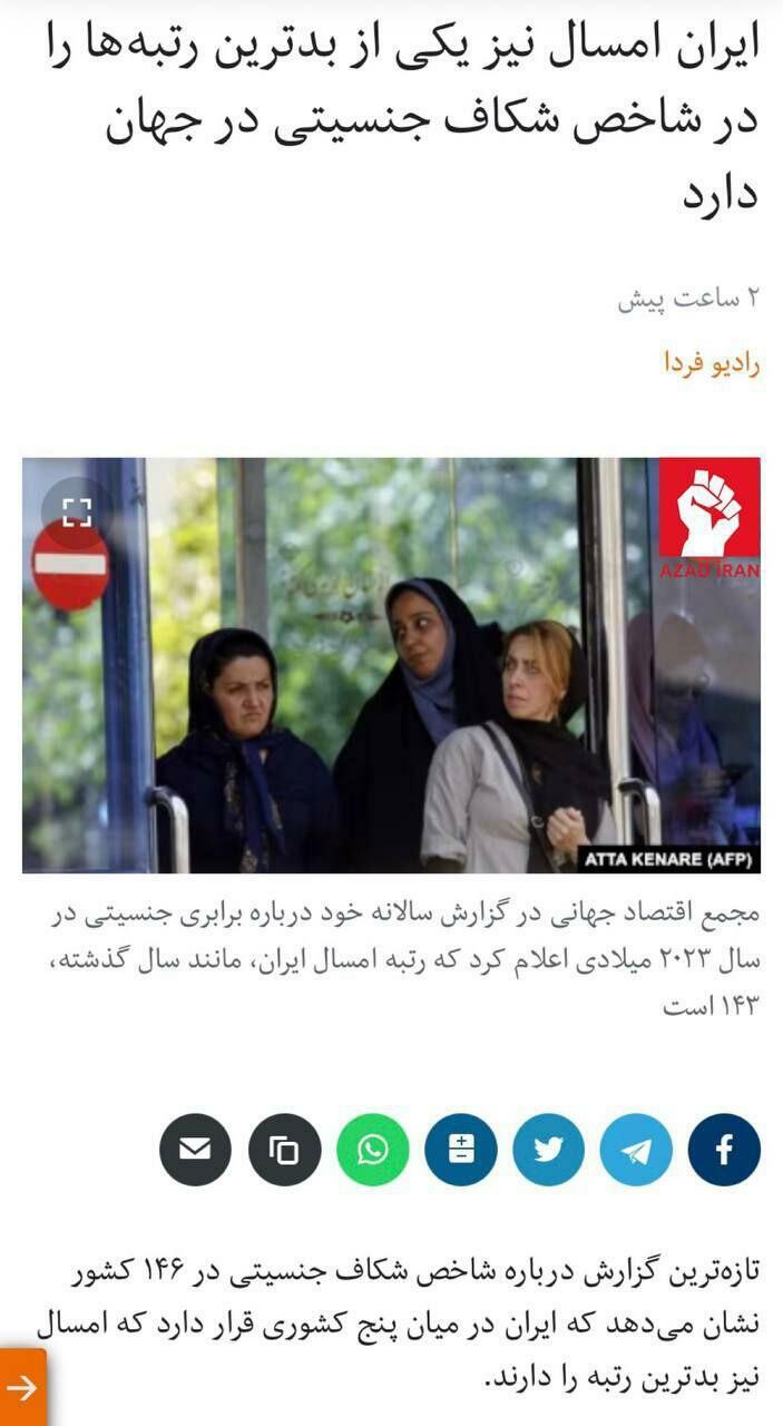 Olaylar.az bildirir ki, bu barədə "Azad İran" "Telegram" kanalı Dünya İqtisadi Forumunun 2023-cü ildə gender bərabərliyi ilə bağlı illik hesabatına istinadla xəbər verib.