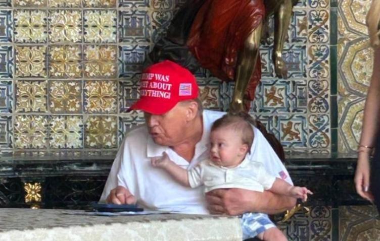 Musavat.com xəbər verir ki, şəkildə ABŞ prezidenti nəvəsini dizinin üstündə oturdub, üzərində "Tramp hər şeydə haqlı idi" şüarı yazılmış qırmızı papaq taxaraq telefonuna baxır.