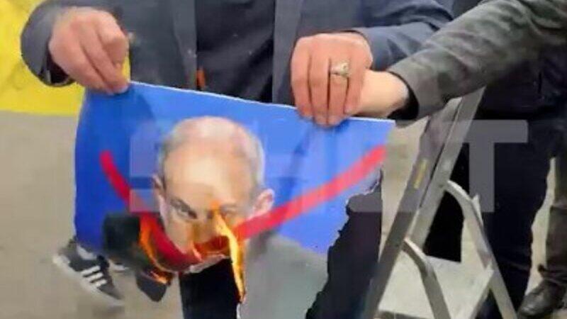 Moskvada Ermənistan səfirliyinin önündə keçirilən aksiyada Paşinyanın şəkli yandırıldı