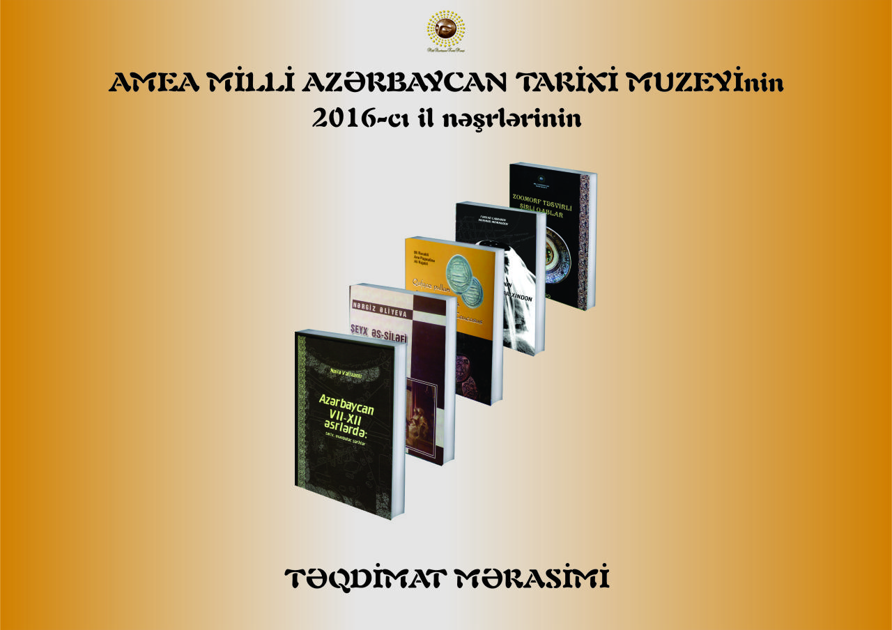 İyunun 8 – də AMEA Milli Azərbaycan Tarixi Muzeyində 2016-cı il nəşrlərinin təqdimat mərasimi keçiriləcək.Muzeydən “Olaylar” – a bildirlib ki, təqdimatda adları çəkilən nəşrlər olacaq: “Milli Azərbaycan Tarixi Muzeyinin Elmi əsərləri”, Nailə Vəlixanlı “Azərbaycan VII-XII əsrlərdə: tarix, mənbələr, şərhlər” , Nərgiz Əliyeva “Şeyx əs-Siləfi və Azərbaycan” , Наргиз Алиева “Ибн Макула о мухаддисах Азербайджана”, Nərgiz Əliyeva, Nasir Quluzadə, Emin Məmmədov “Davud bəy Şərifov”, Əli Rəcəbli “Qafqaz Pulları” , Fərhad Cabbarov, Məmməd Məmmədov “Şollar-Bakı su kəmərinin tarixindən” , “Azərbaycan qadın geyim bəzəkləri”. Kitab-albom. Müəllif və tərtibatçı: Gülzadə Abdulova, “Zoomorf təsvirli şirli qablar”. Kataloq. Mətnin müəllifləri: Nasir Quluzadə və Genadiy Ağayev , “Azərbaycanın soyuq və odlu silahları”. Kataloq. Mətnin müəllifi: Sevinc Vahabova, “Reinkarnasiya – tarixi eksponatlar”. Kataloq. Mətnin müəllifi: Səbuhi Əhmədov.