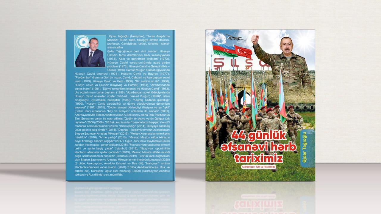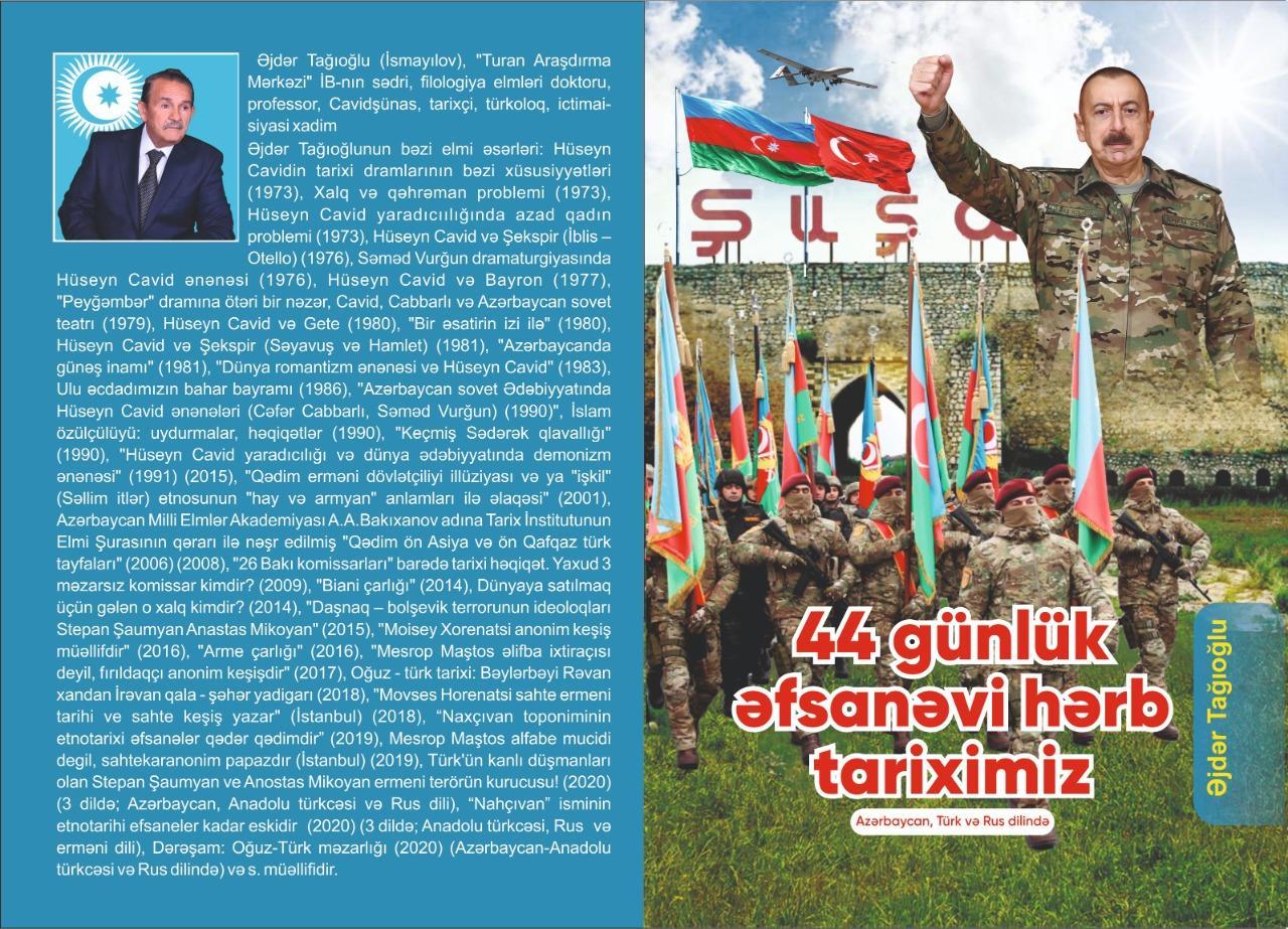 25 İyun 2021 12:46 ƏdəbiyyatTanınmış ictimai-siyasi xadim, filoloq, tarixçi, türkoloq, Turan Araşdırma Mərkəzi İB-nin sədri, professor Əjdər Tağıoğlunun (İsmayılovun) - "44 günlük əfsanəvi hərb tariximiz" adlı kitabı azərbaycan, anadolu türkcəsi və rus dillərində "Elm və təhsil" nəşriyyatında çapdan çıxıb.