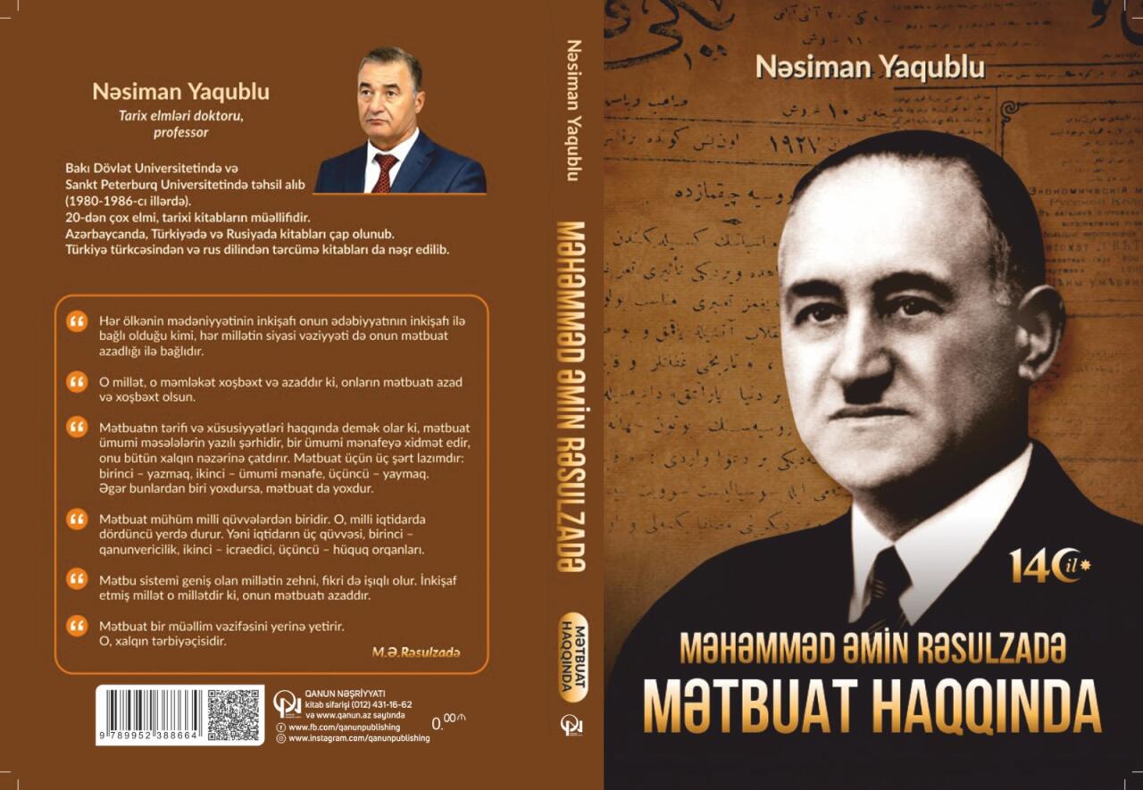 25 Yanvar 2024 11:40 ƏdəbiyyatTarix elmləri doktoru, professor Nəsiman Yaqublunun M.Ə.Rəsulzadənin mətbuat haqqındakı yazılarını və fəaliyyətini əhatə edən,
