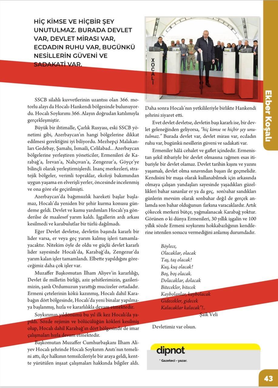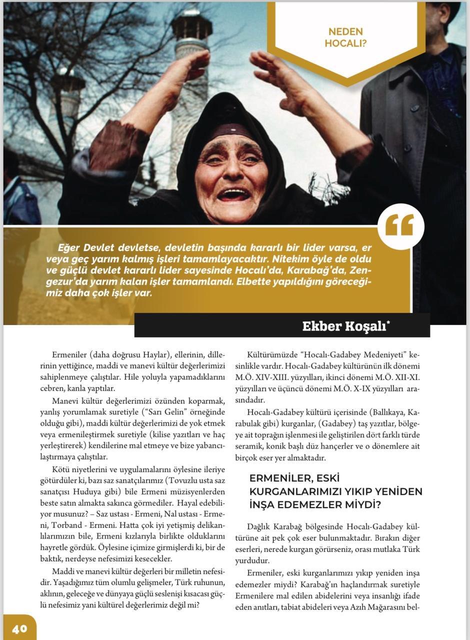 9 Aprel 2024 13:07 ƏdəbiyyatAzərbaycanlı yazar Əkbər Qoşalının Türk Dünyası Araşdırmaları Vəqfinin İstanbulda çıxan ünlü "TARİX" (Türk dünyası tarix, mədəniyyət) dərgisinin yeni sayında "Nə üçün Xocalı?" adlı ("Neden Hocalı?") yazısı yayımlanıb.