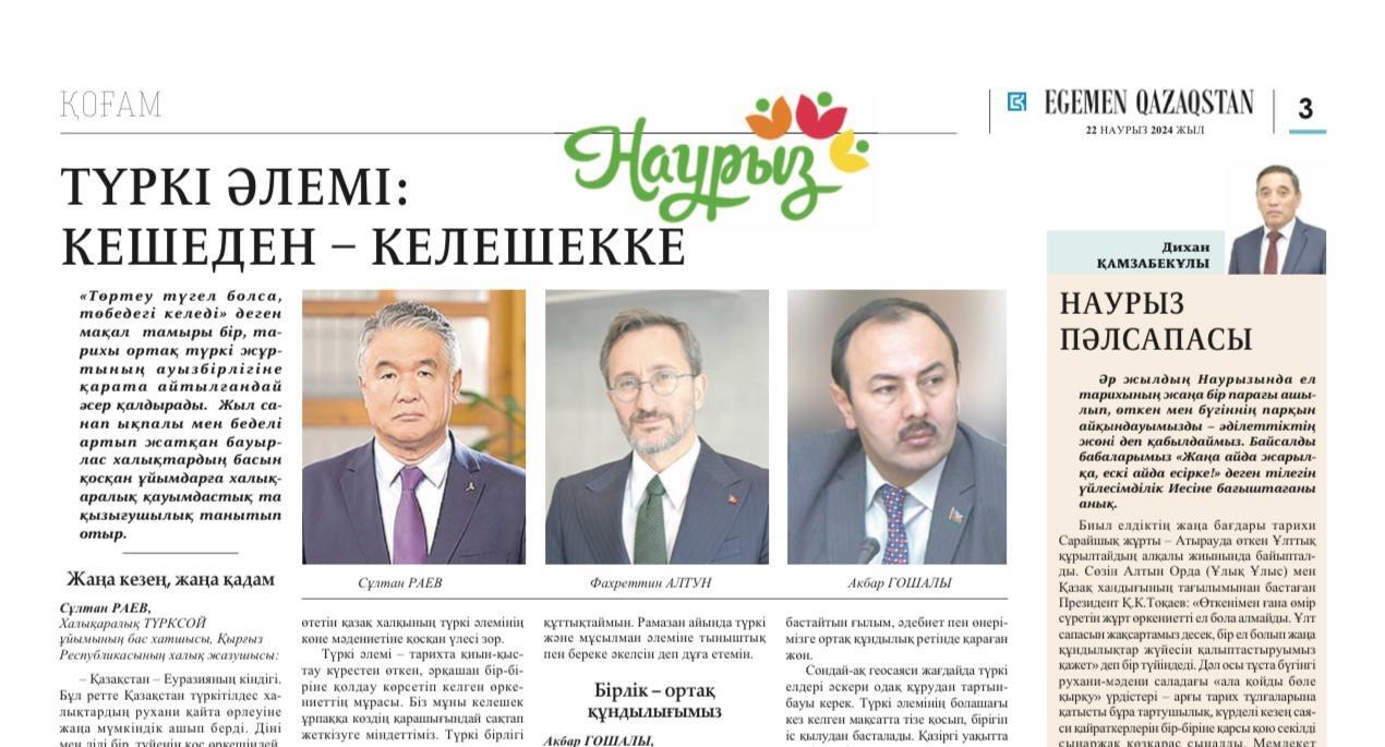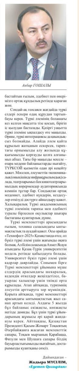 Qardaş Qazaxıstanın (ümumən Türküstanın) ən tirajlı qəzeti olan "Egemen Qazaxıstan" ("Egemen Qazaqstan") isə bir qədər öncə, Əkbər Qoşalının "Birlik bizim ümumi dəyərimizdir" adlı yazısını yayınlamışdı. Bu yazıda Türk dünyasının "Ortaq keçmişdən ortaq gələcəyə" götürən mədəniyyət iqliminə, türk birliyinin alternativlərin ən yaxşısı olduğuna vurğu edilib.