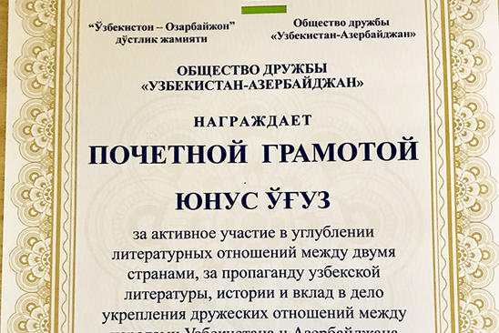 Özbəkistandakı Heydər Əliyev adına Azərbaycan Mədəniyyət Mərkəzindən “Olaylar”a verilən məlumata görə azərbaycanlı yazıçı, tarixi romanlar müəllifi Yunus Oğuz Özbəkistan-Azərbaycan Dostluq Cəmiyyətinin Fəxri Fərmanı ilə təltif edilib.