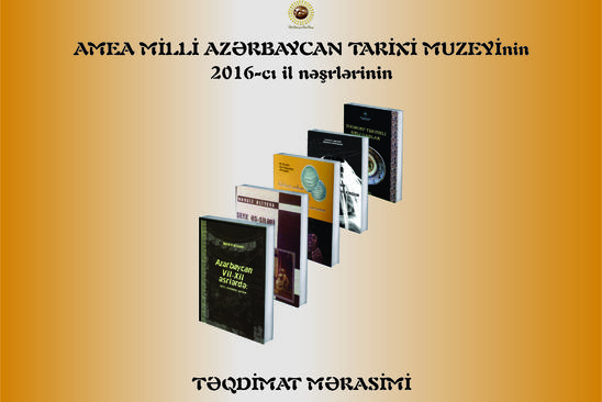 İyunun 8 – də AMEA Milli Azərbaycan Tarixi Muzeyində 2016-cı il nəşrlərinin təqdimat mərasimi keçiriləcək.Muzeydən “Olaylar” – a bildirlib ki, təqdimatda adları çəkilən nəşrlər olacaq: “Milli Azərbaycan Tarixi Muzeyinin Elmi əsərləri”, Nailə Vəlixanlı “Azərbaycan VII-XII əsrlərdə: tarix, mənbələr, şərhlər” , Nərgiz Əliyeva “Şeyx əs-Siləfi və Azərbaycan” , Наргиз Алиева “Ибн Макула о мухаддисах Азербайджана”, Nərgiz Əliyeva, Nasir Quluzadə, Emin Məmmədov “Davud bəy Şərifov”, Əli Rəcəbli “Qafqaz Pulları” , Fərhad Cabbarov, Məmməd Məmmədov “Şollar-Bakı su kəmərinin tarixindən” , “Azərbaycan qadın geyim bəzəkləri”. Kitab-albom. Müəllif və tərtibatçı: Gülzadə Abdulova, “Zoomorf təsvirli şirli qablar”. Kataloq. Mətnin müəllifləri: Nasir Quluzadə və Genadiy Ağayev , “Azərbaycanın soyuq və odlu silahları”. Kataloq. Mətnin müəllifi: Sevinc Vahabova, “Reinkarnasiya – tarixi eksponatlar”. Kataloq. Mətnin müəllifi: Səbuhi Əhmədov.
