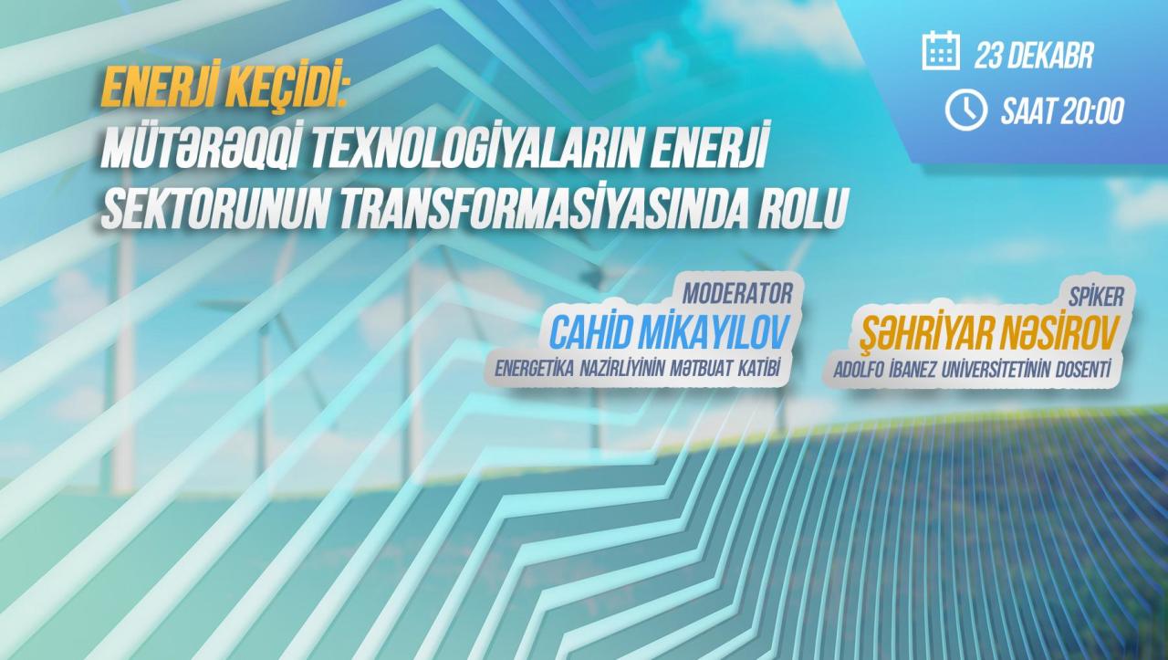 Məlumata görə, vebinarda qurumun mətbuat katibi Cahid Mikayılovun moderatorluğu ilə Adolfo İbanez Universitetinin dosenti Şəhriyar Nəsirov qlobal enerji bazarında innovativ və qabaqcıl bərpa olunan enerji texnologiyalarının rolu, texnoloji irəliləyişlər, ekoloji cəhətdən daha təmiz enerjiyə keçidin sürətləndirilməsi imkanları və digər məsələlər barədə ətraflı məlumat veriləcək, iştirakçıların mövzu ilə bağlı sualları cavablandıracaq.