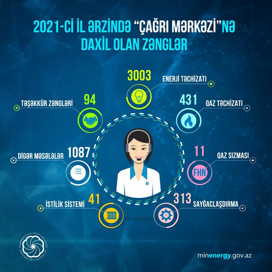 "OLAYLAR" Energetika Nazirliyinə istinadən xəbər verir ki daxil olan zənglərin 3003-ü elektrik enerjisi təchizatı, 431-i qaz təchizatı, 313-ü sayğacların quraşdırılması, 41-i mərkəzi istilik sistemi, 1087-si isə digər məsələlərlə bağlı olub. Zənglərin 94-nü təşəkkür xarakterli, 11-ni isə qaz sızması və ya dəm qazı ilə bağlı Fövqəladə Hallar Nazirliyindən daxil olmuş müraciətlər təşkil edib.